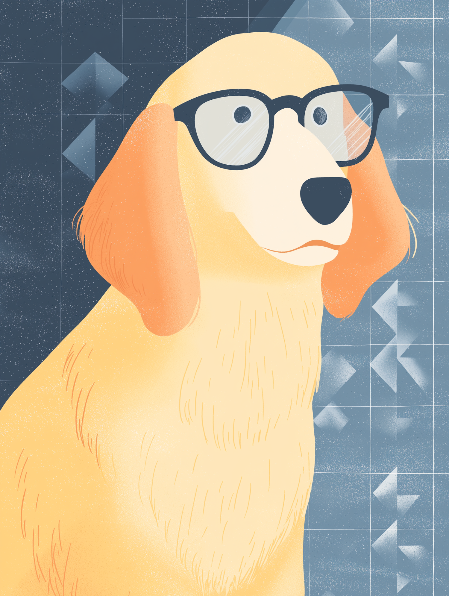 Cartoon golden retriever with glasses against a blue geometric background, blending humor with a modern artistic touch.