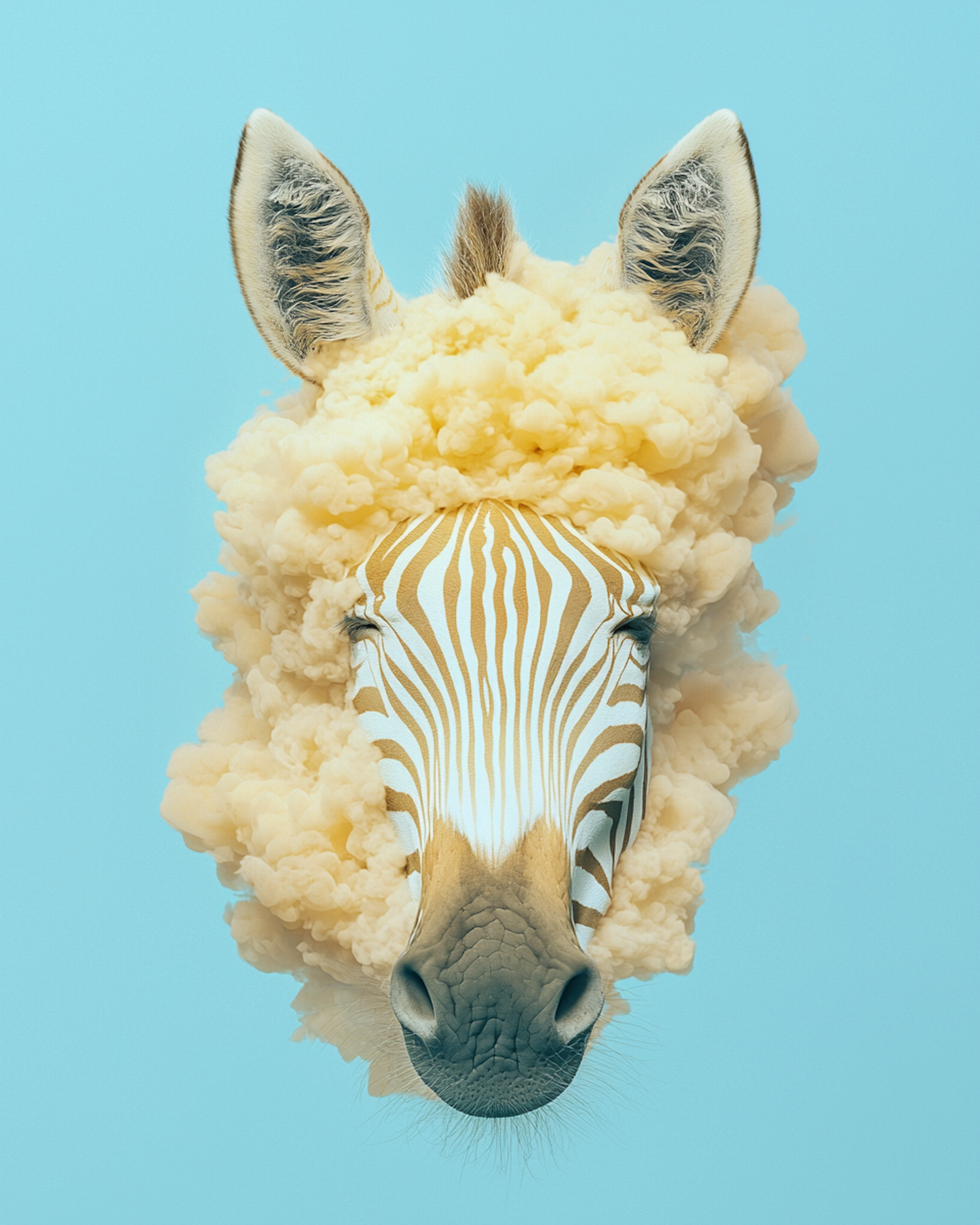 A surreal zebra with golden stripes and a cloud-like mane on a cyan background. A whimsical blend of nature and fantasy.