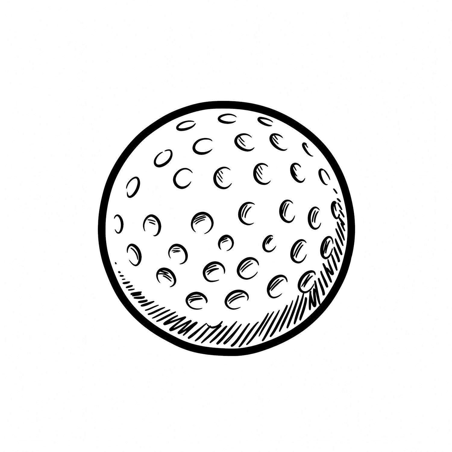 A detailed black-and-white illustration of a golf ball with dimples and shading, set against a plain white background.