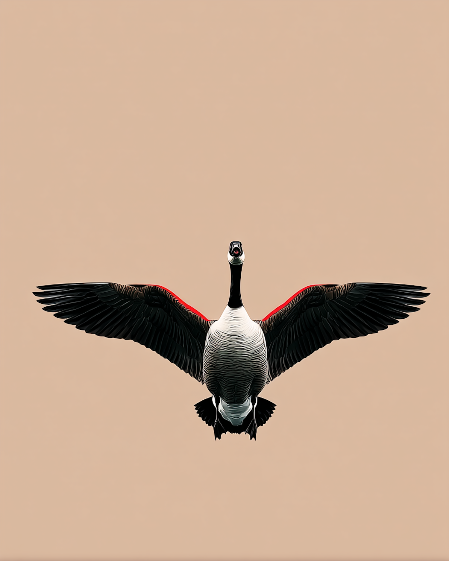Illustration of a beautiful goose in flight against a plain beige background, showcasing its majestic spread wings and vibrant plumage details.