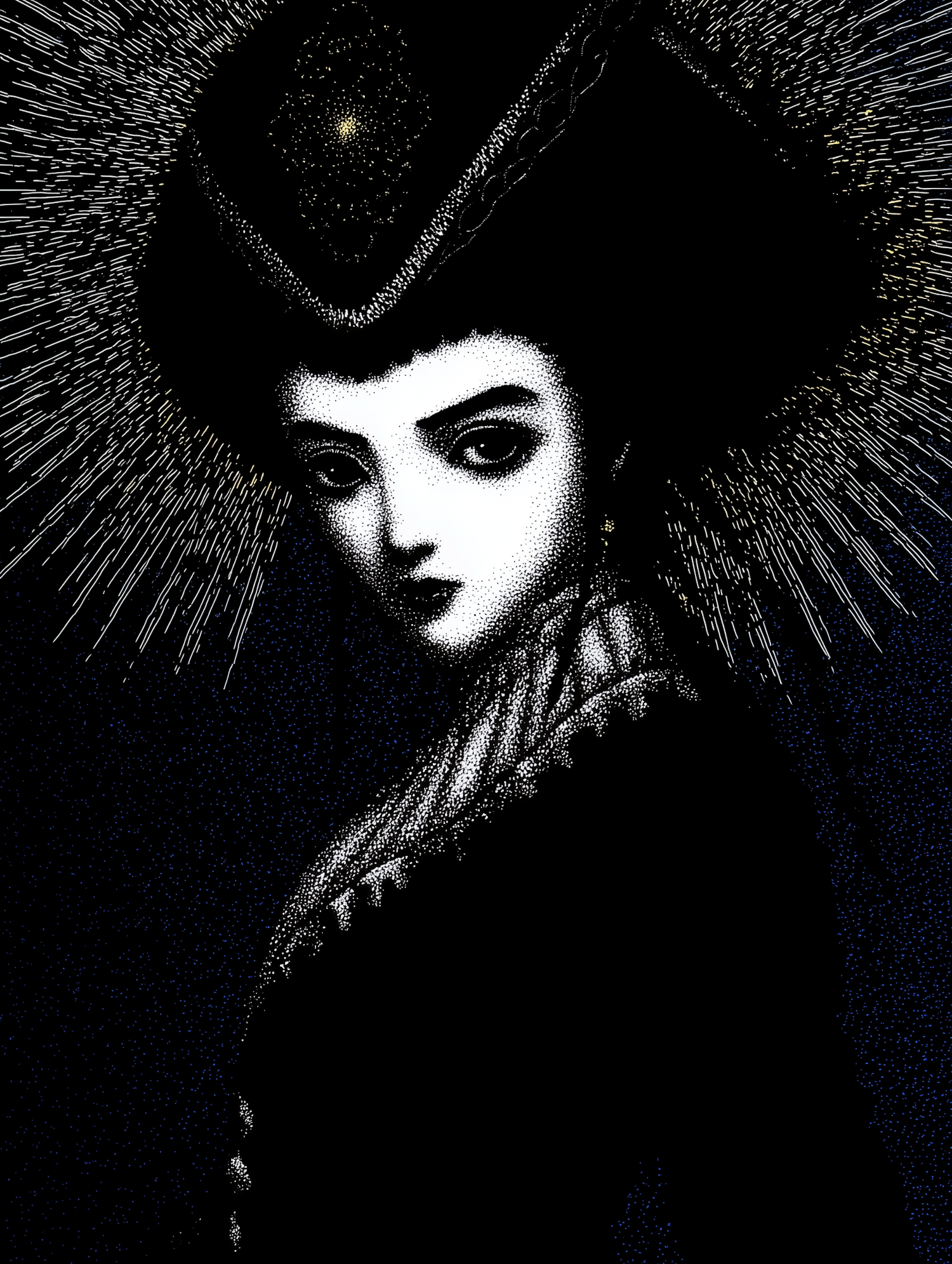 Gothic-style illustration of a woman with a radiant halo, dark hat, and piercing gaze, set against a dramatic dark background.
