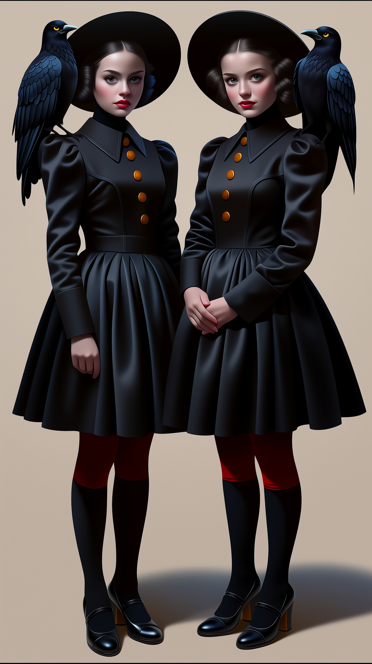 Two women in matching black outfits with ravens on their shoulders, creating a mysterious and gothic aesthetic.
