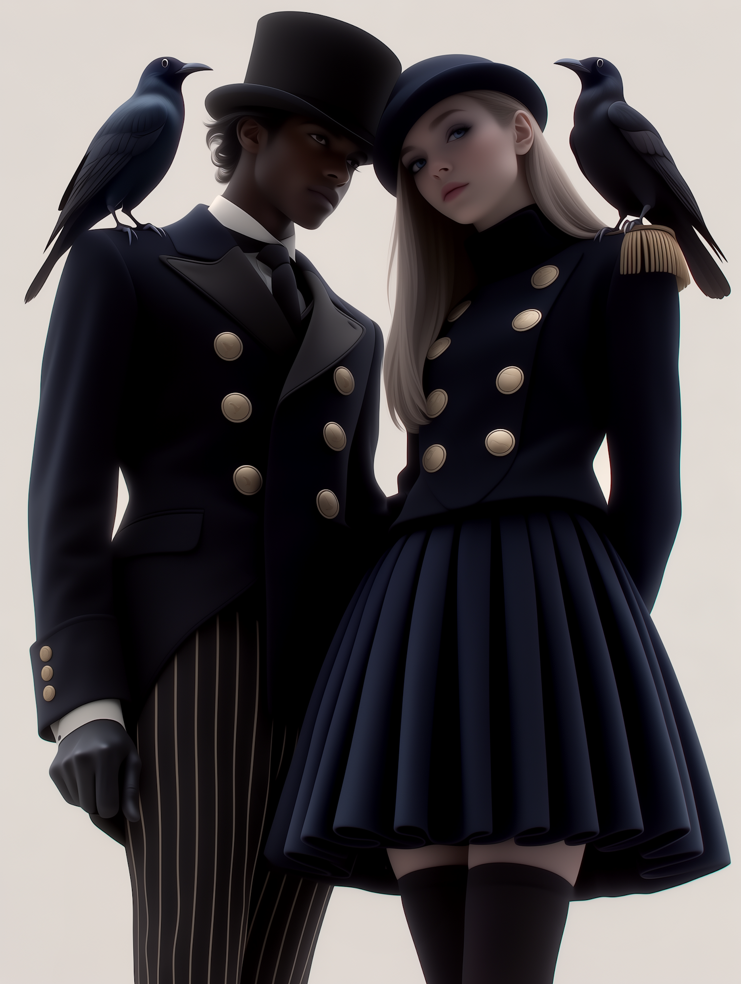 Stylized illustration of two individuals in formal attire with crows perched on their shoulders, exuding a mysterious and gothic vibe.