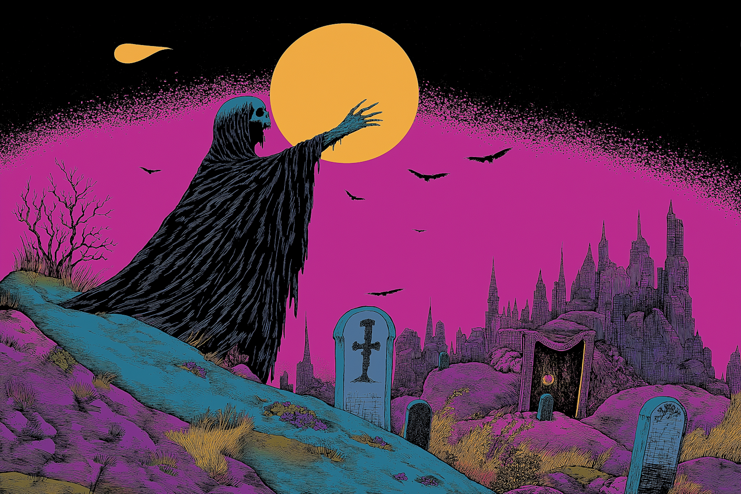 A skeletal figure reaches for a glowing moon in a surreal, magenta sky. Gravestones and bats enhance the eerie, mystical atmosphere.
