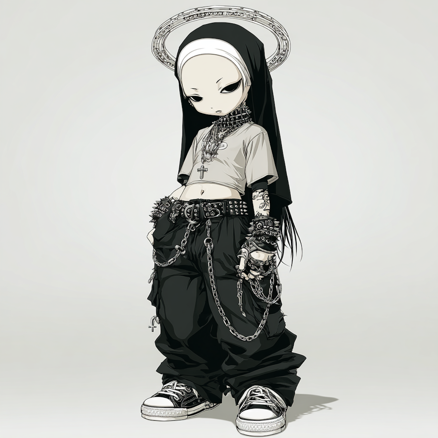 Stylized character in gothic-punk attire with a nun's habit and halo, featuring spiked accessories and chains on a plain background.