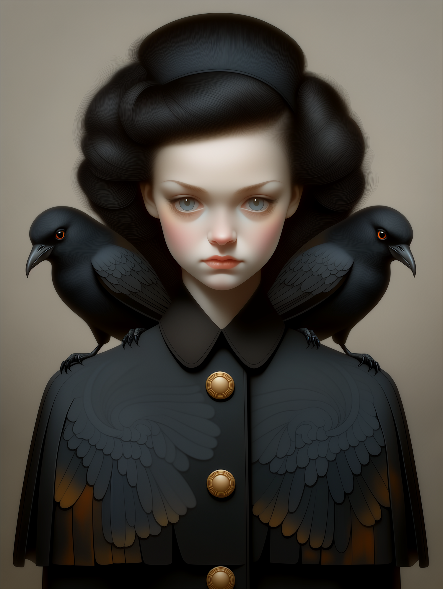 Stylized portrait of a pale individual with black hair, ornate coat, and two crows on their shoulders, set against a muted background.