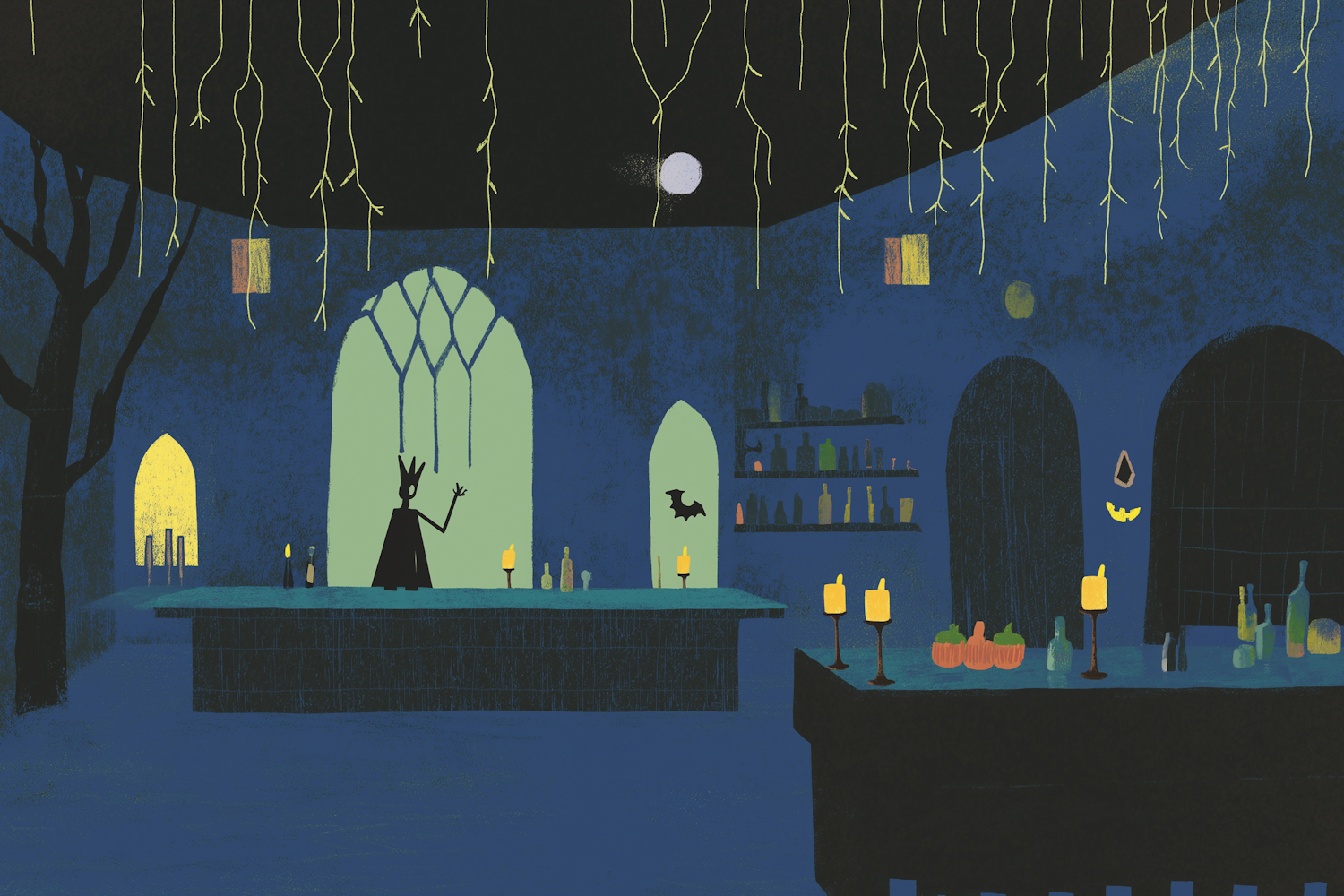 Gothic room with a shadowy figure, glowing windows, and Halloween decor. Eerie ambiance with candles, bottles, and a flying bat.