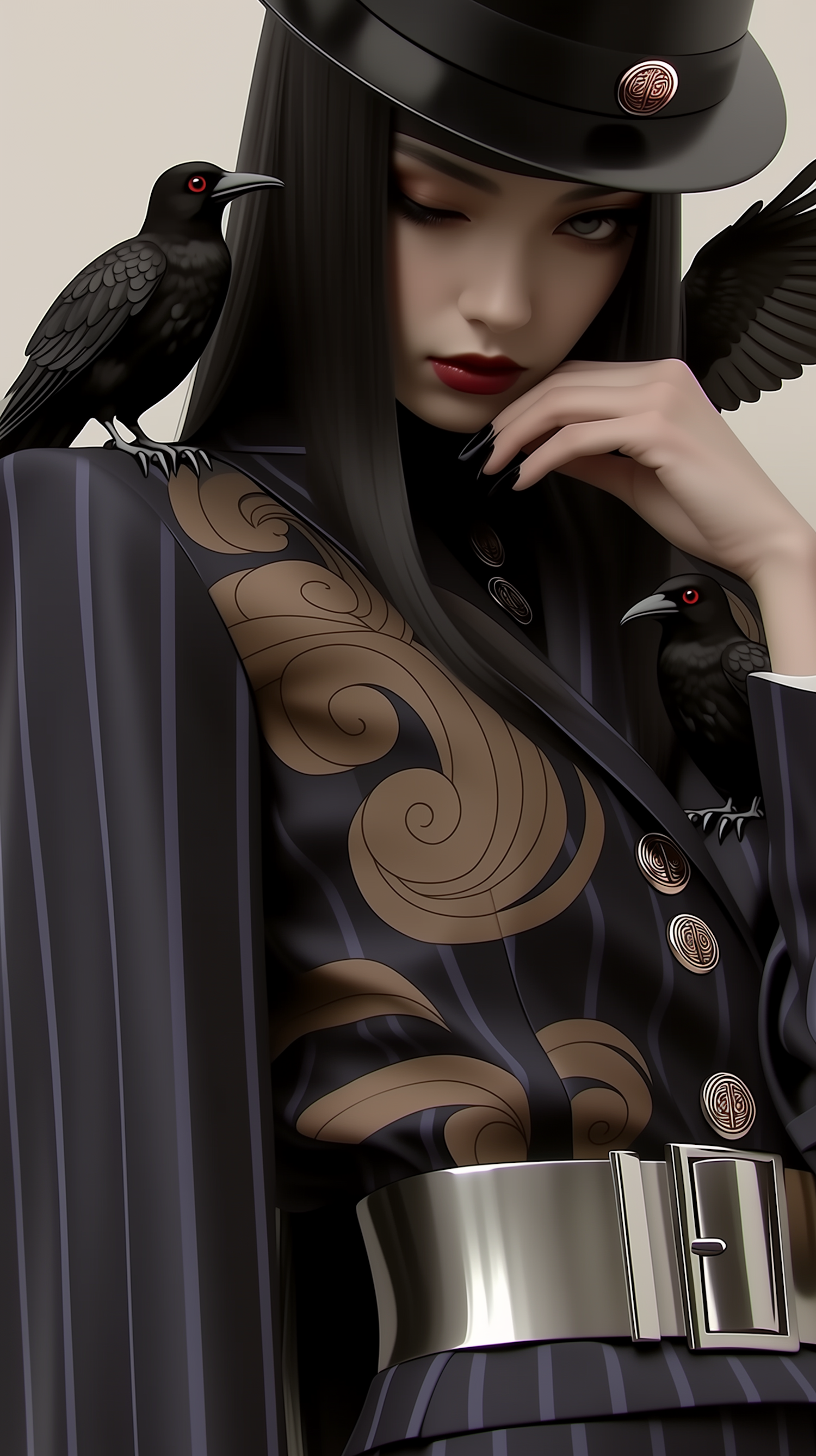 Stylized illustration of a woman in a dark outfit with golden patterns, accessorized with a hat and crows, creating a mysterious gothic vibe.
