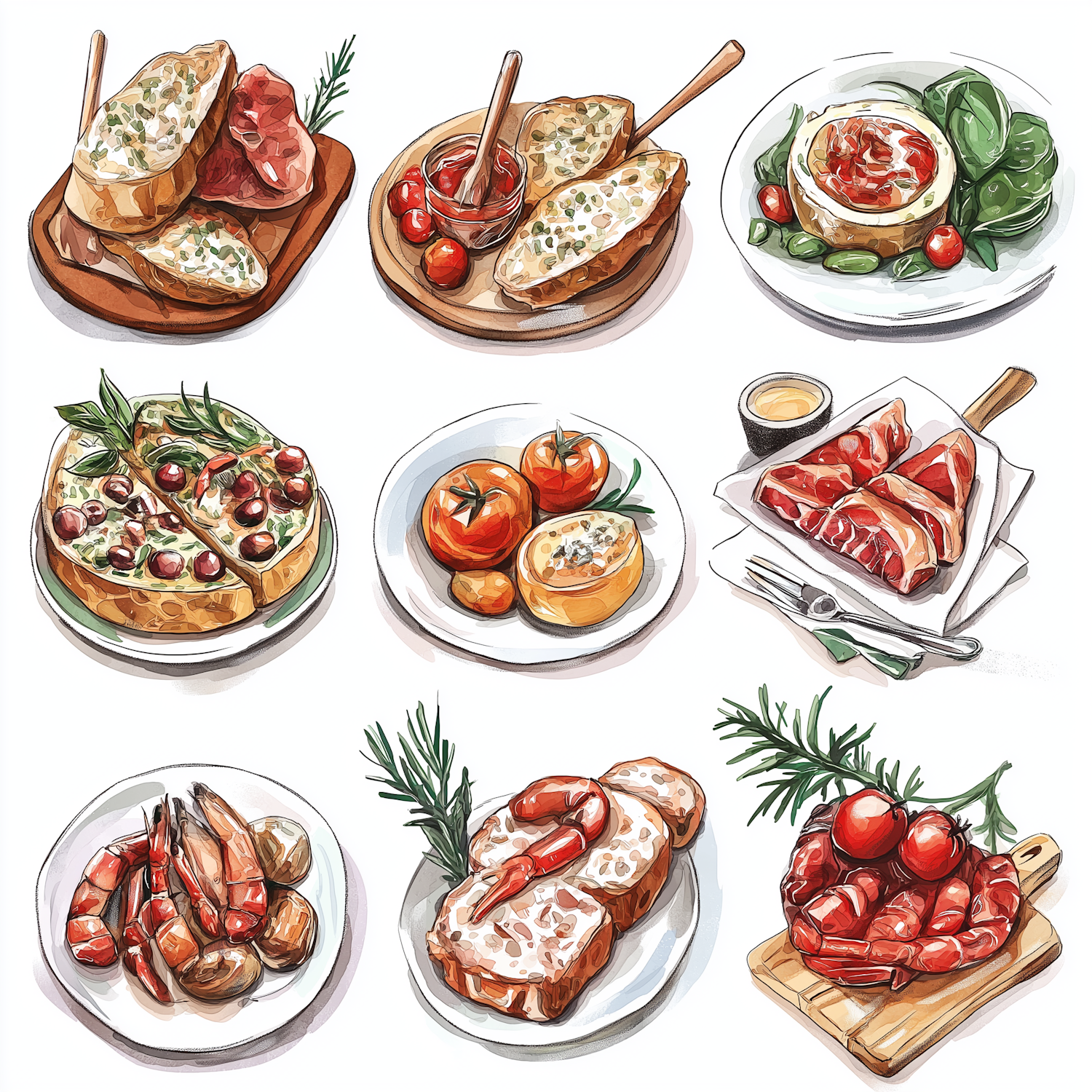 A colorful illustration of gourmet appetizers, from shrimp and prosciutto to creamy spreads on bread, perfect for food lovers and party inspiration.