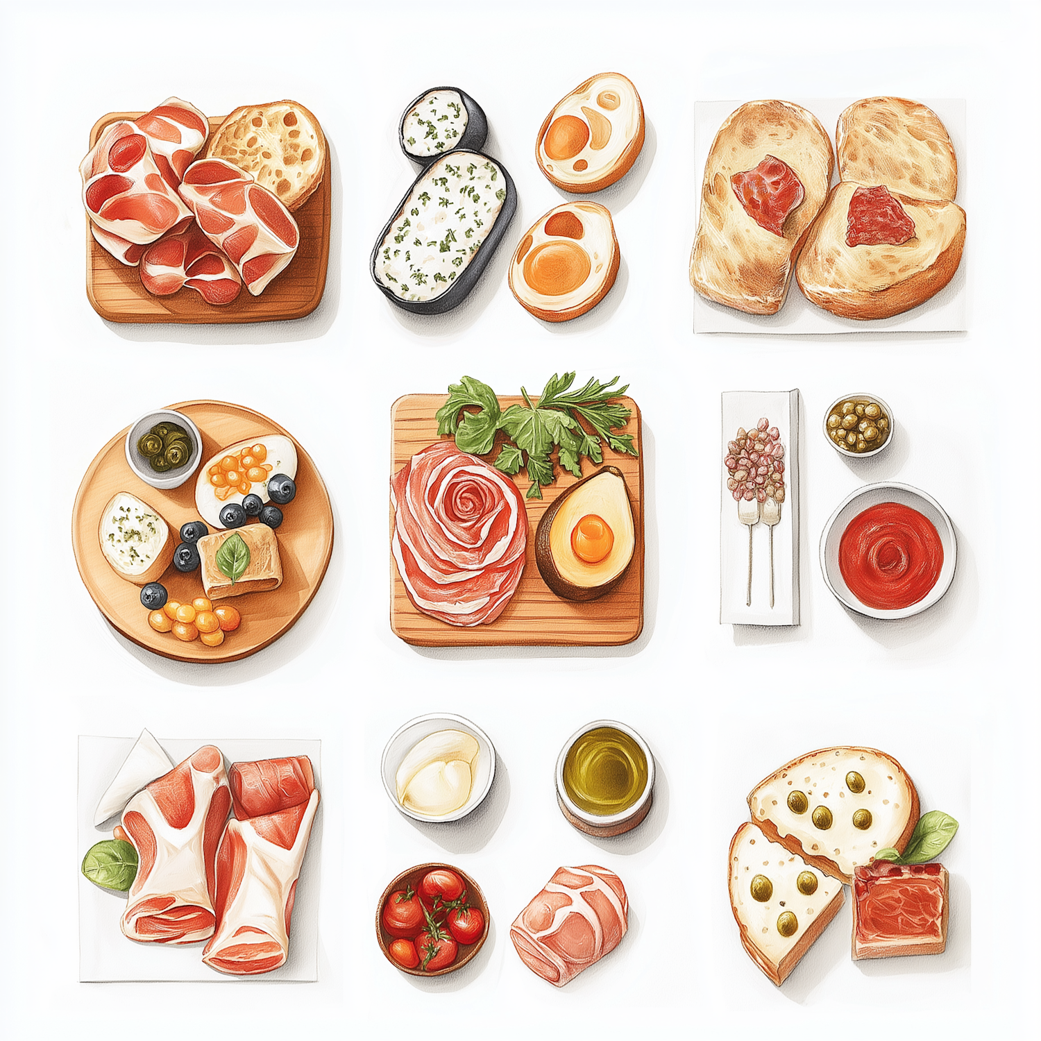 A beautifully illustrated grid of gourmet foods, featuring meats, cheeses, bread, eggs, and fresh produce, perfect for food lovers.