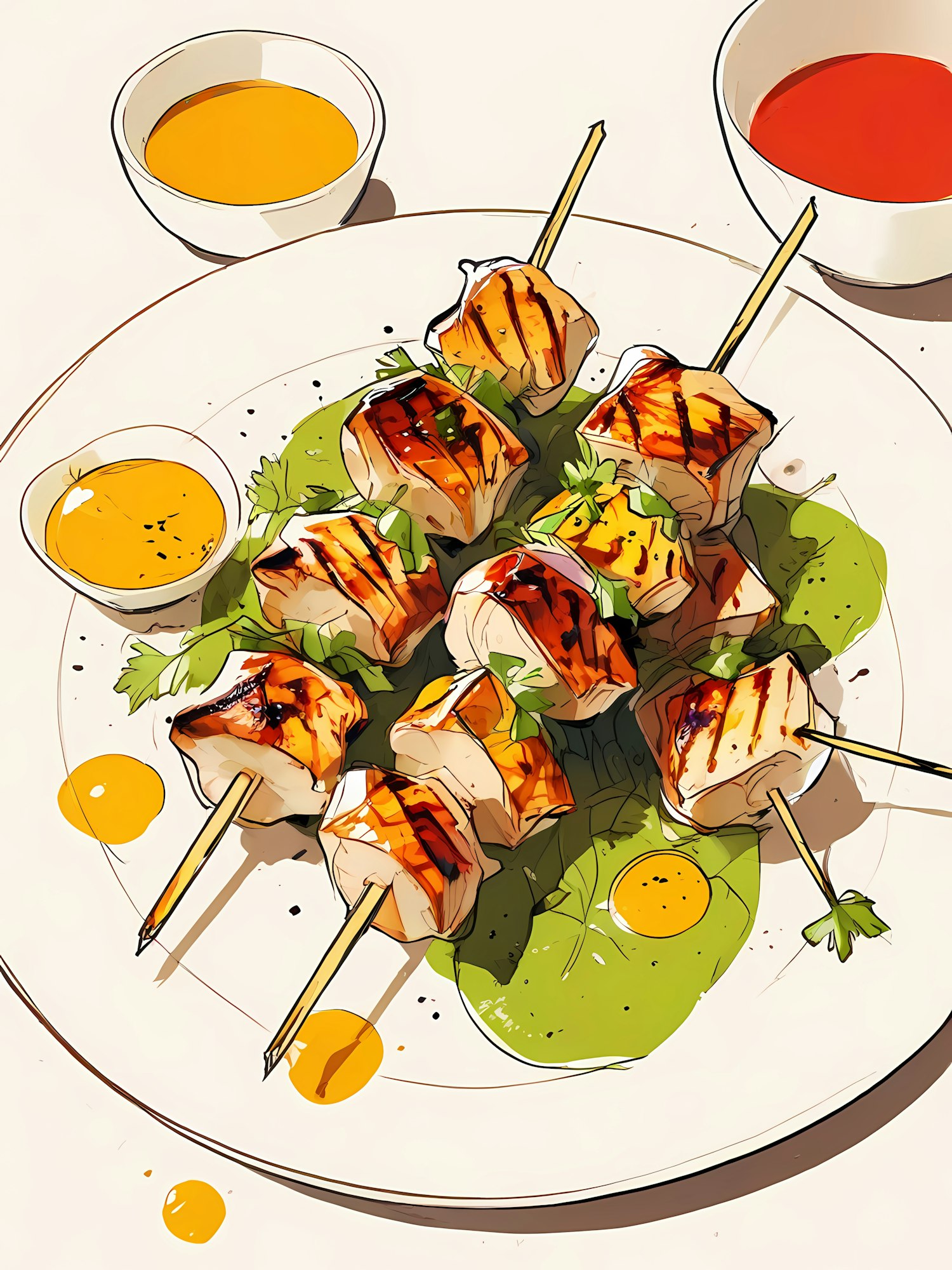 Illustrated grilled chicken skewers with vibrant sauces on a white plate, garnished with fresh herbs. Perfect for a colorful meal.