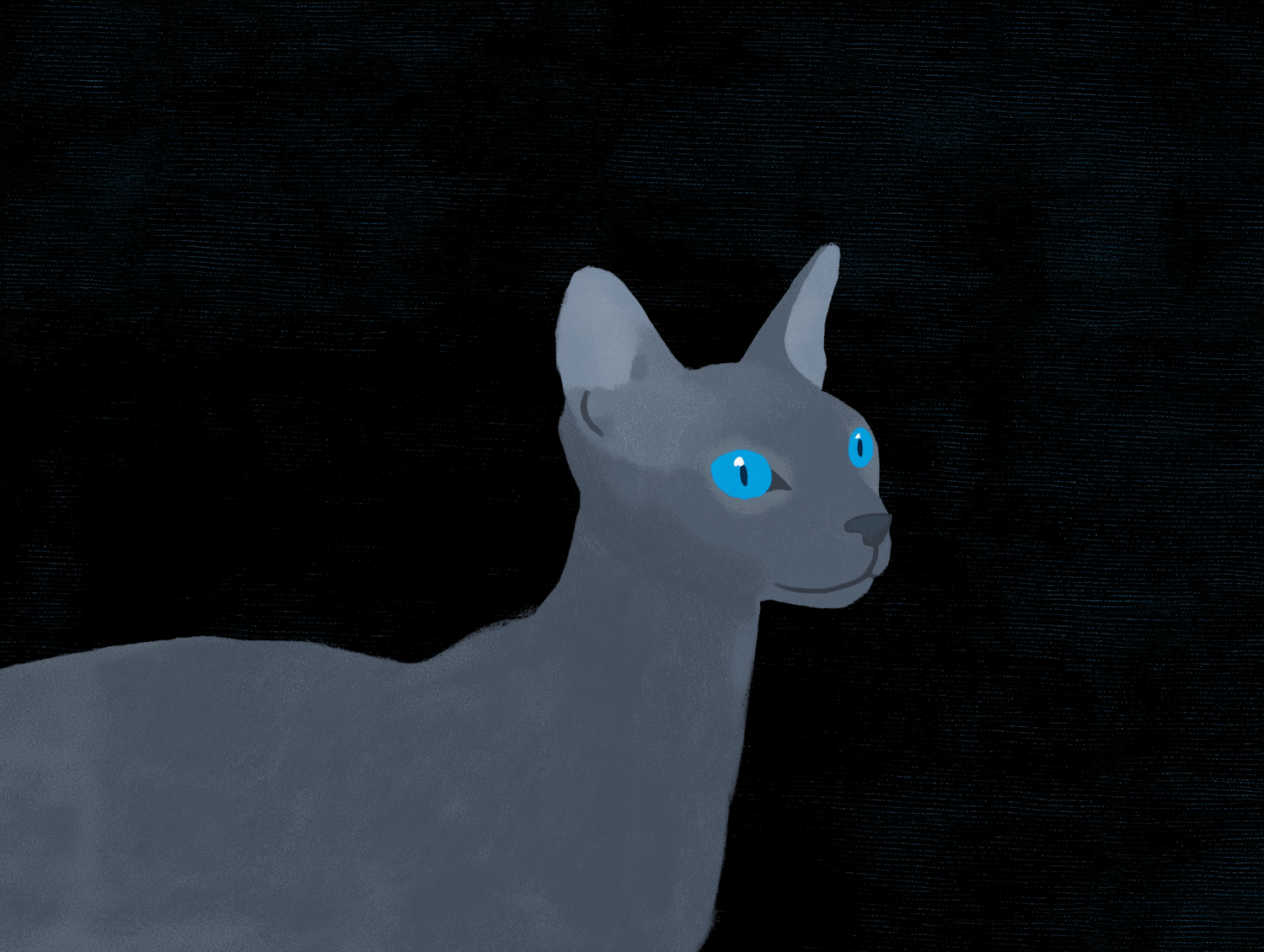 An artistic illustration of a sleek gray Sphynx cat with vivid blue eyes, set against a dark, textured background, capturing an elegant profile.
