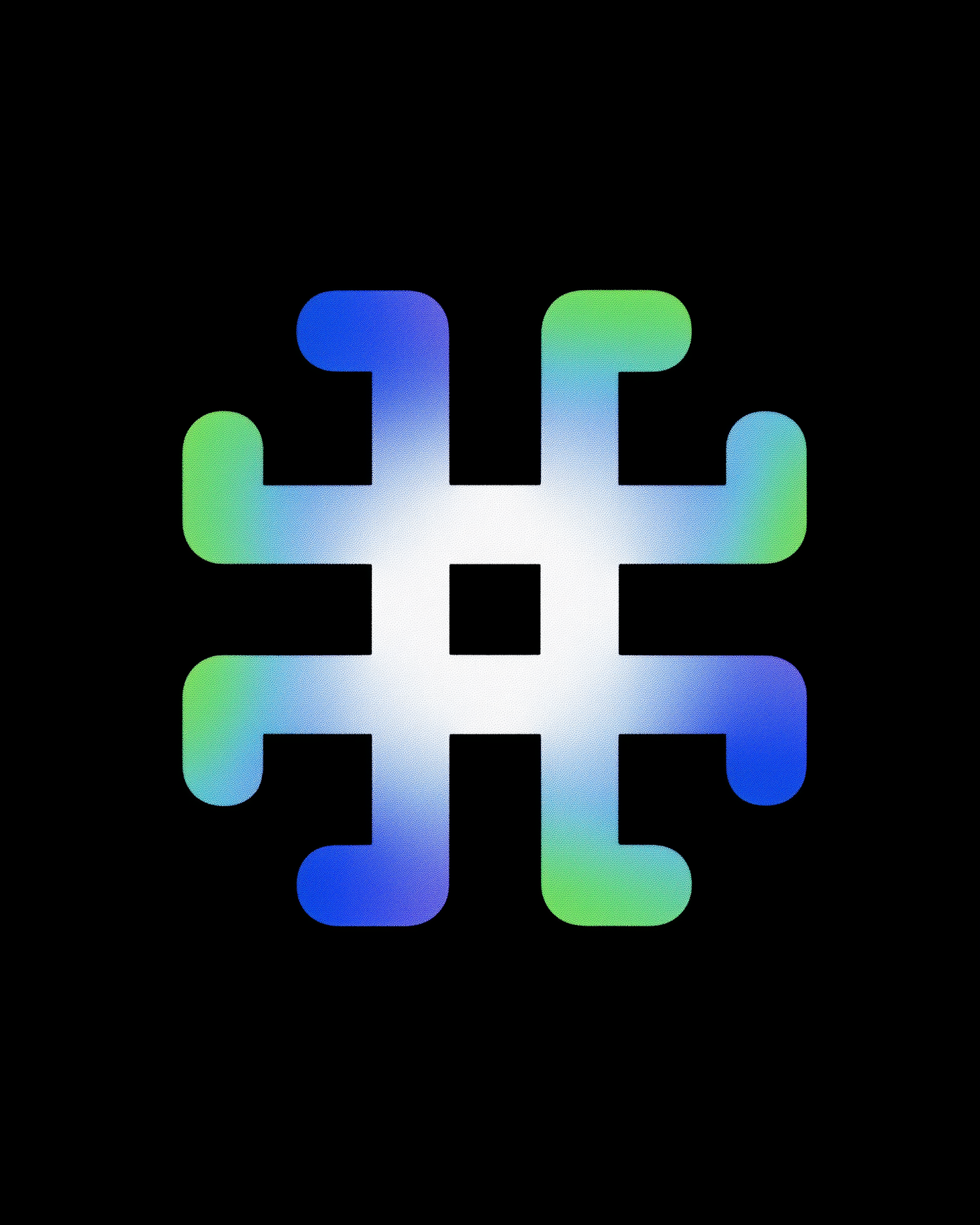 Abstract gradient symbol with green, blue, and white hues on a black background, resembling a modern hashtag or cross design.