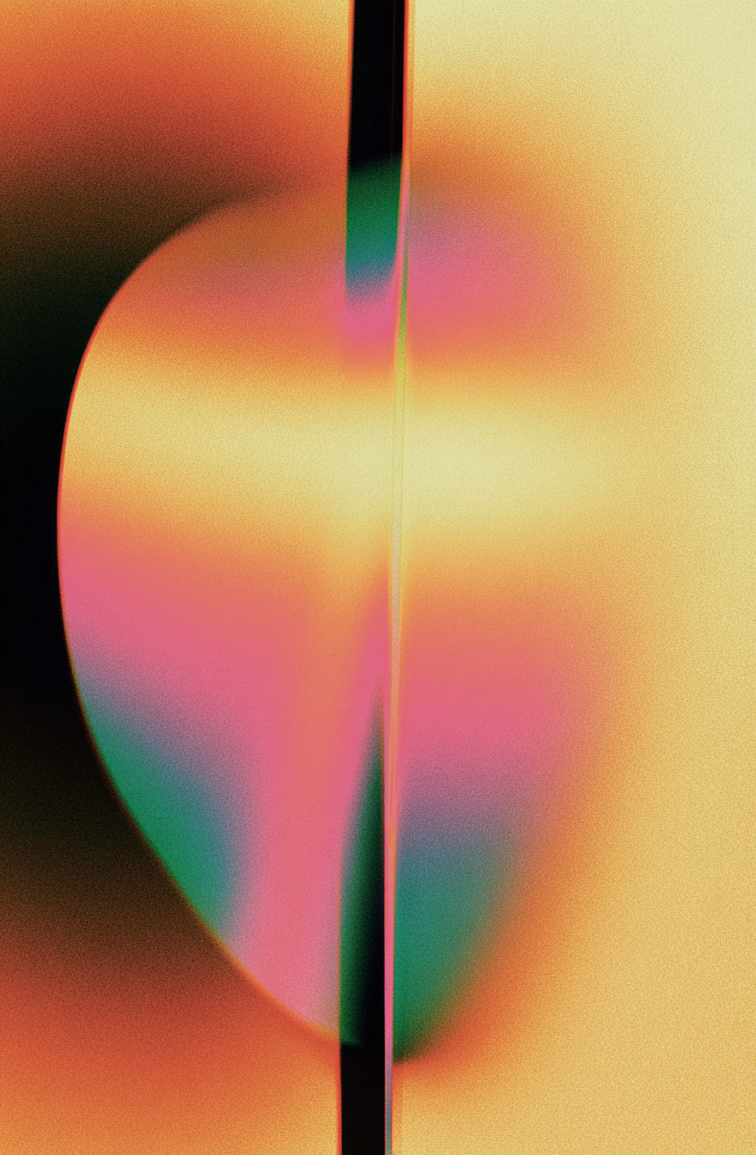 Abstract artwork with vibrant gradients of orange, pink, green, and yellow, featuring a central vertical line for symmetry.