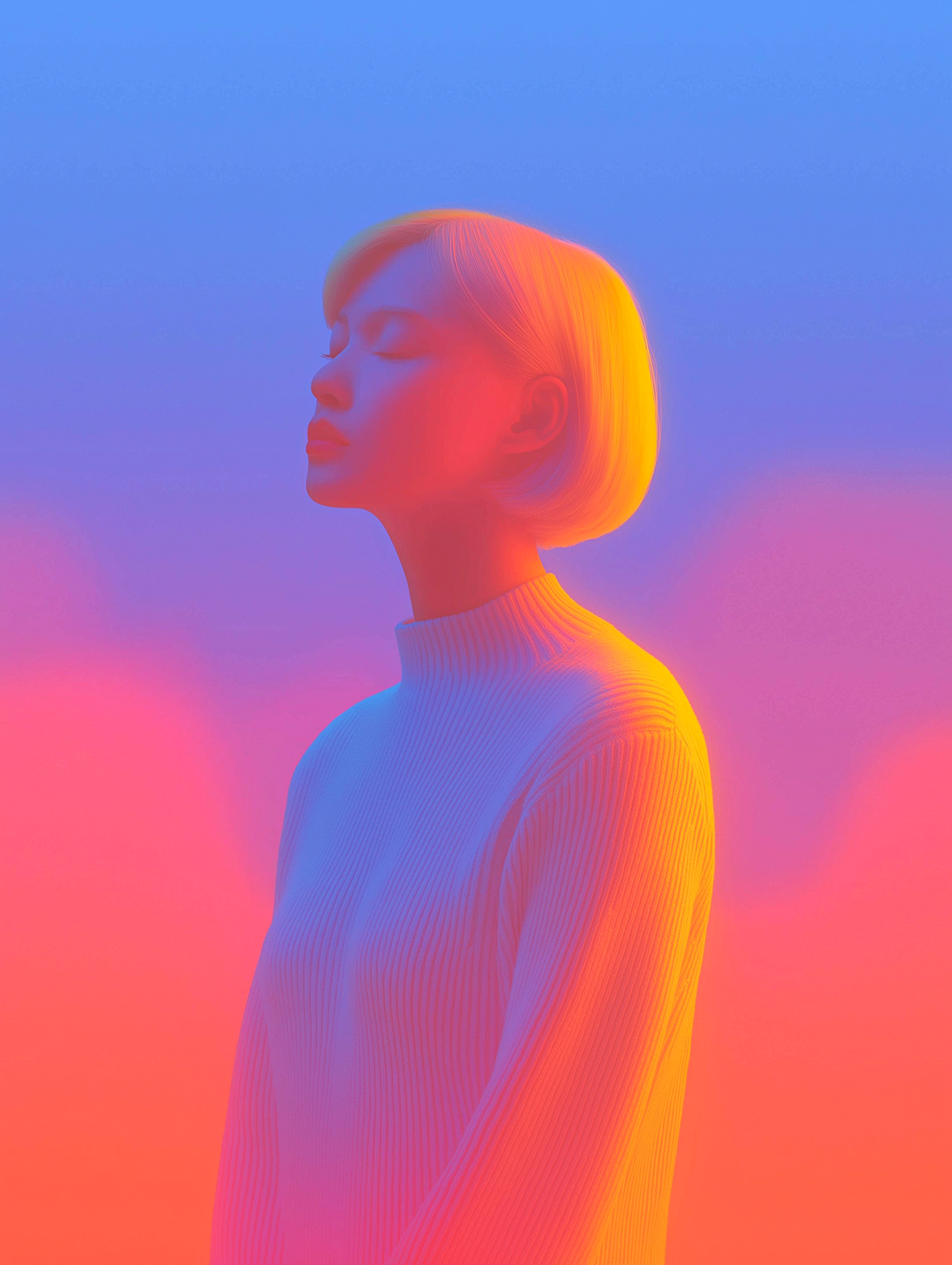 A serene portrait of a person in vibrant gradient lighting, blending warm and cool tones for a surreal and artistic effect.