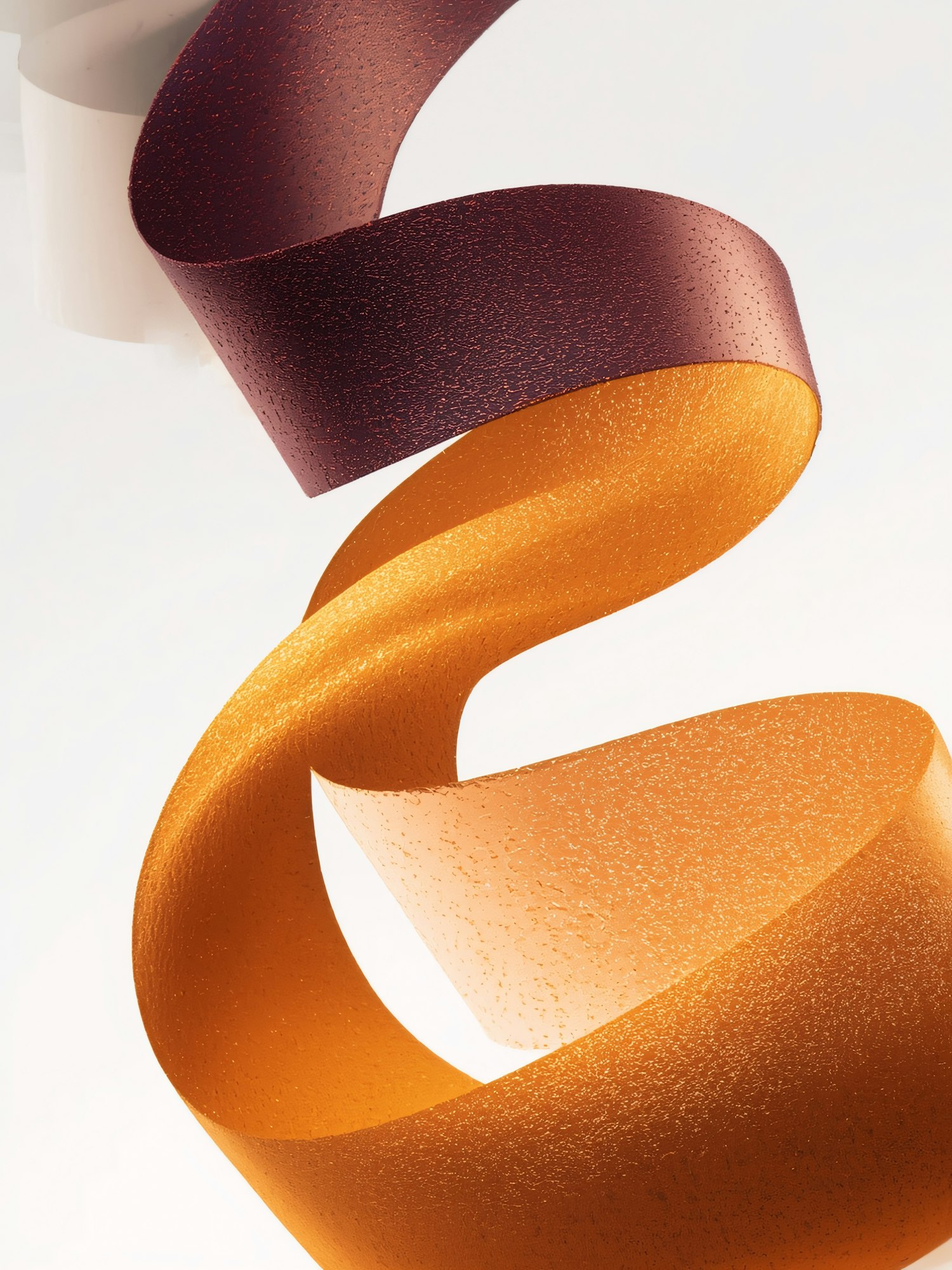 A textured ribbon in maroon and orange twists gracefully against a white background, showcasing vibrant colors and intricate details.