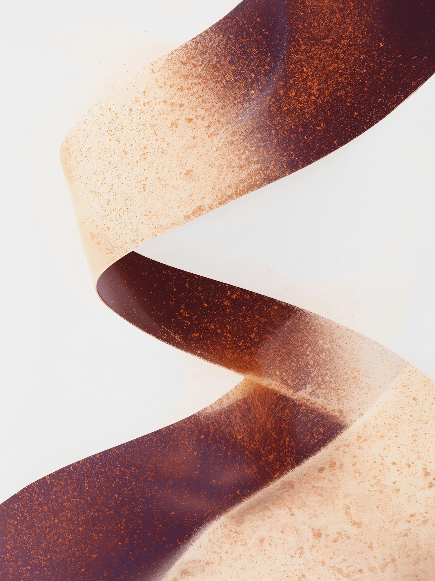 A close-up of a textured, translucent ribbon with a gradient from brown to beige, twisting gracefully against a white background.