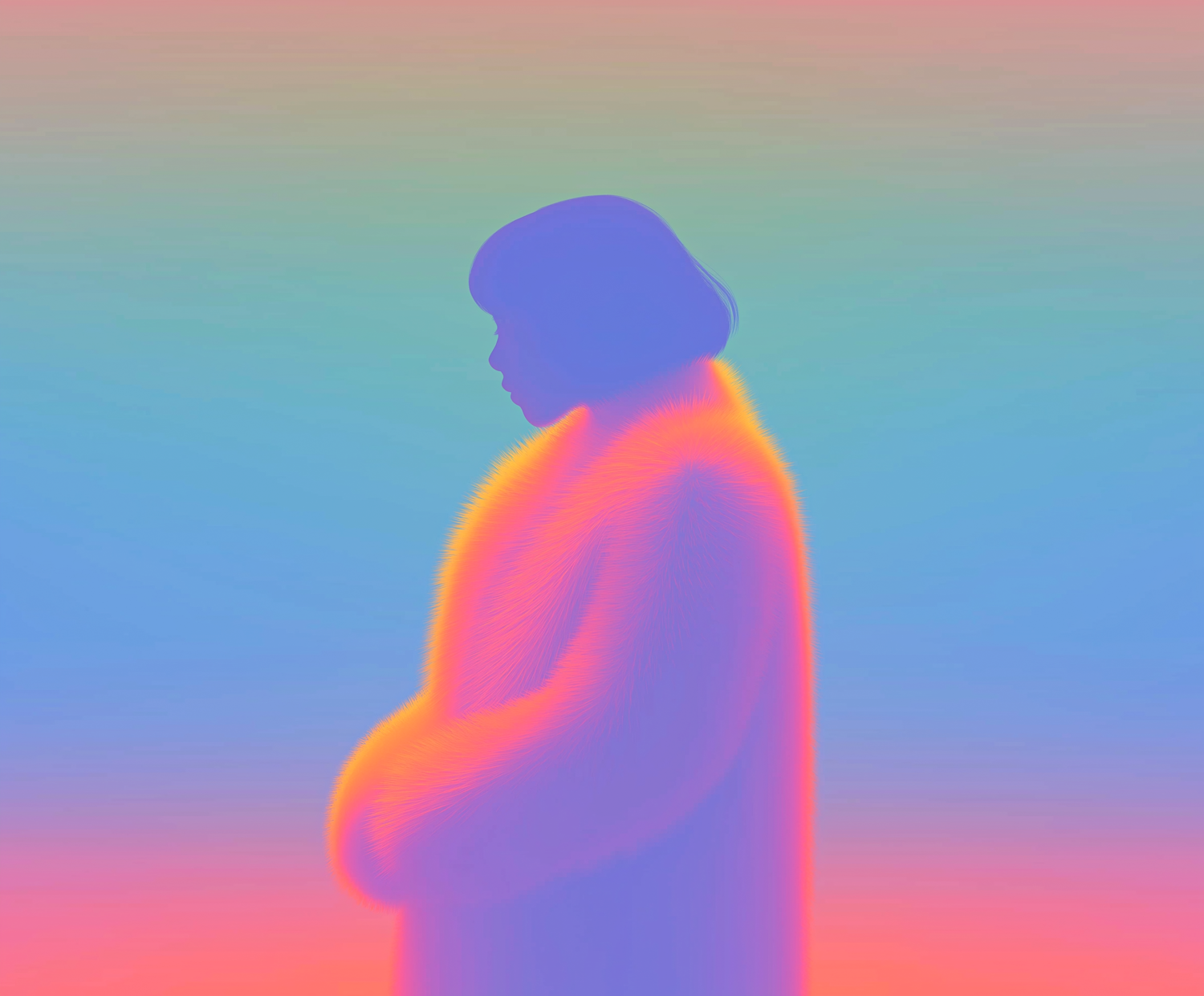 A vibrant, gradient silhouette of a person in a glowing fur-like garment against a pastel background, blending warm and cool tones.