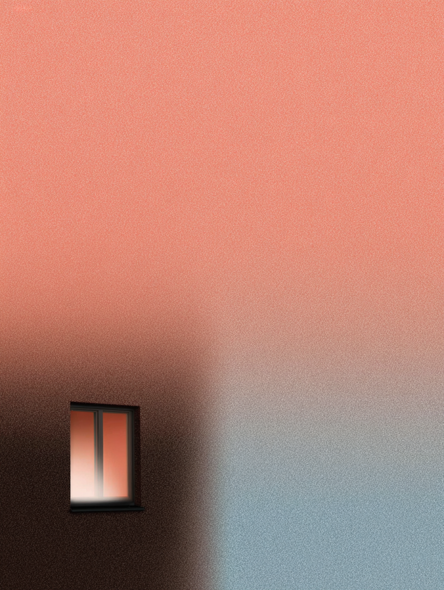 Minimalist artwork of a textured wall with a gradient from coral to blue and a single glowing window, creating a modern and abstract vibe.
