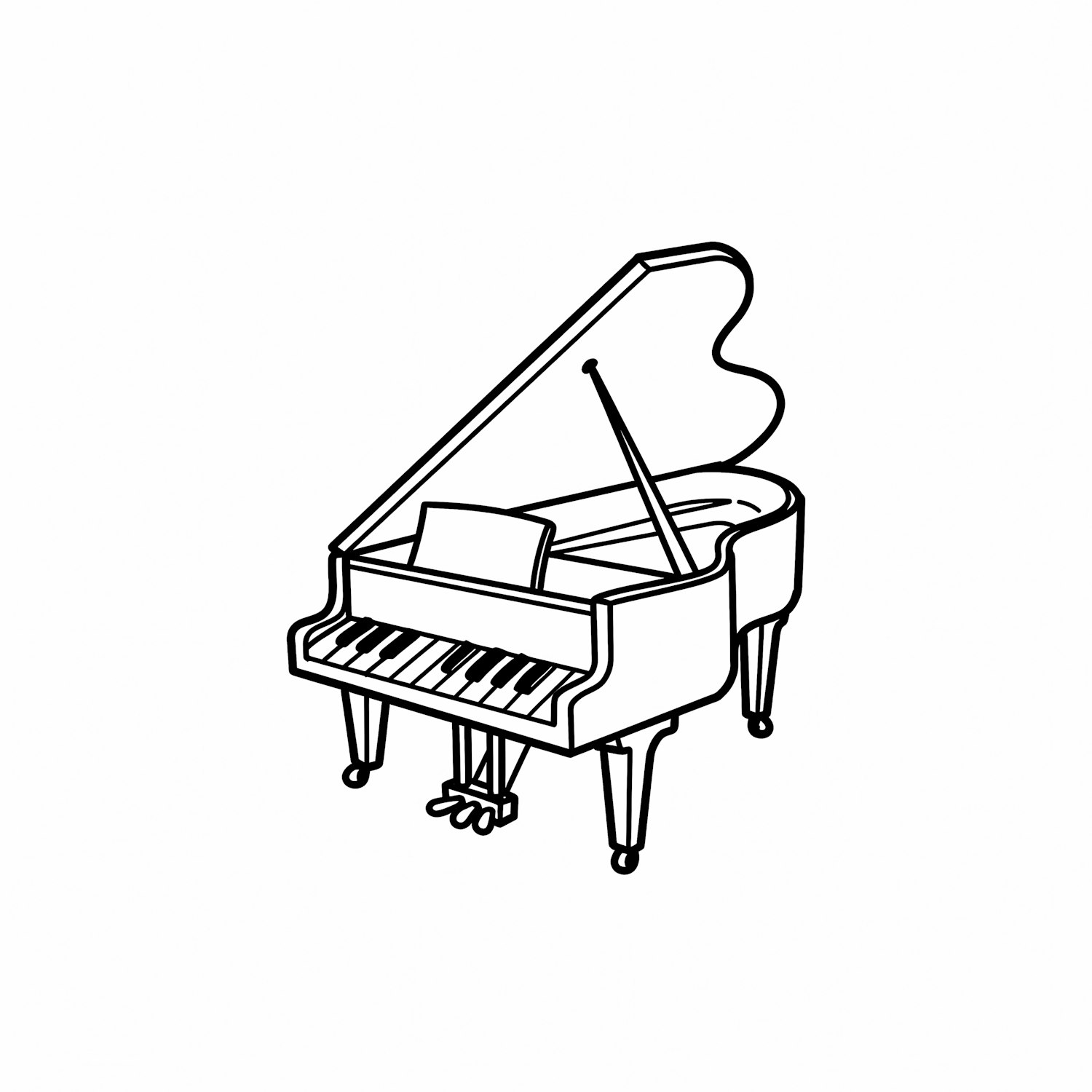 A simple black and white line drawing of a grand piano with its lid open, showing the keyboard and music stand.