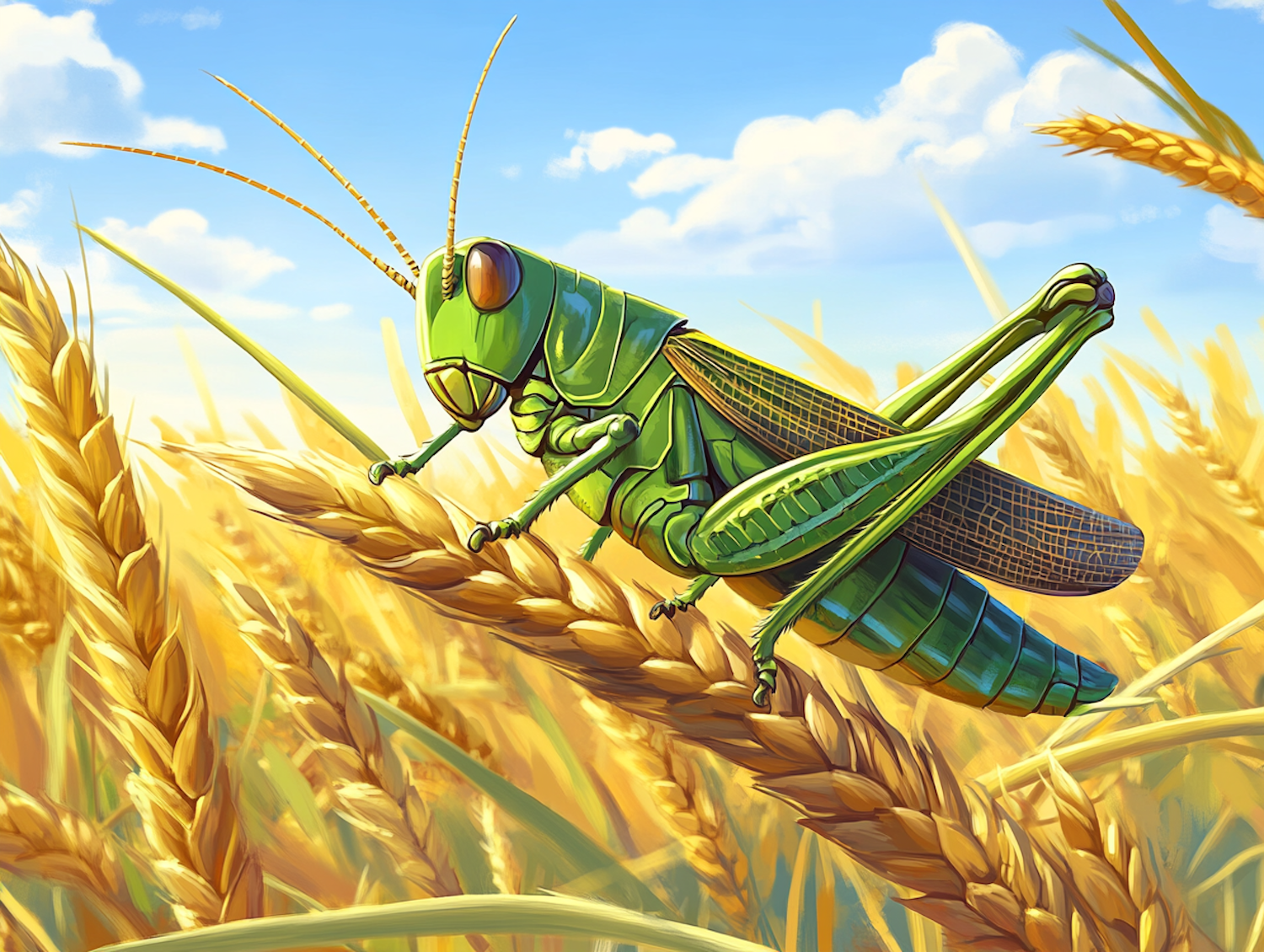Detailed illustration of a green grasshopper on golden wheat stalks under a sunny blue sky, showcasing vibrant colors and intricate details.