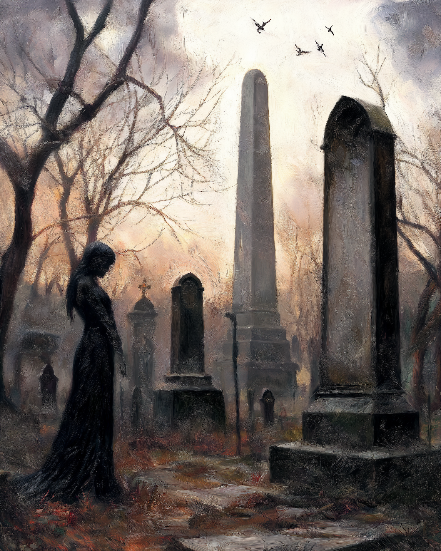 Impressionistic graveyard scene with a mourning woman, weathered tombstones, bare trees, and a dusky sky with birds in flight.