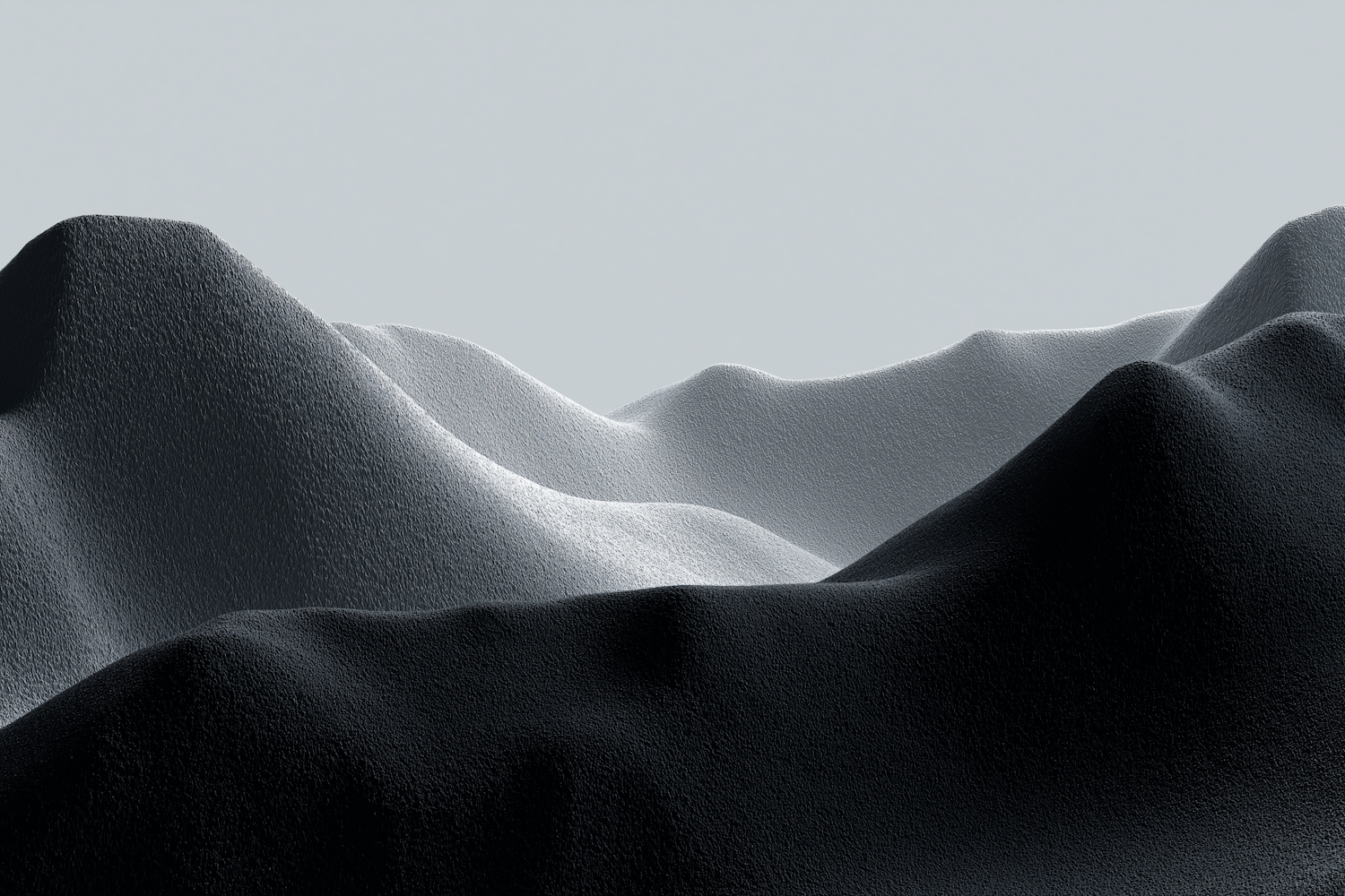 Abstract grayscale hills with textured surfaces and soft lighting, creating a serene and minimalist landscape.