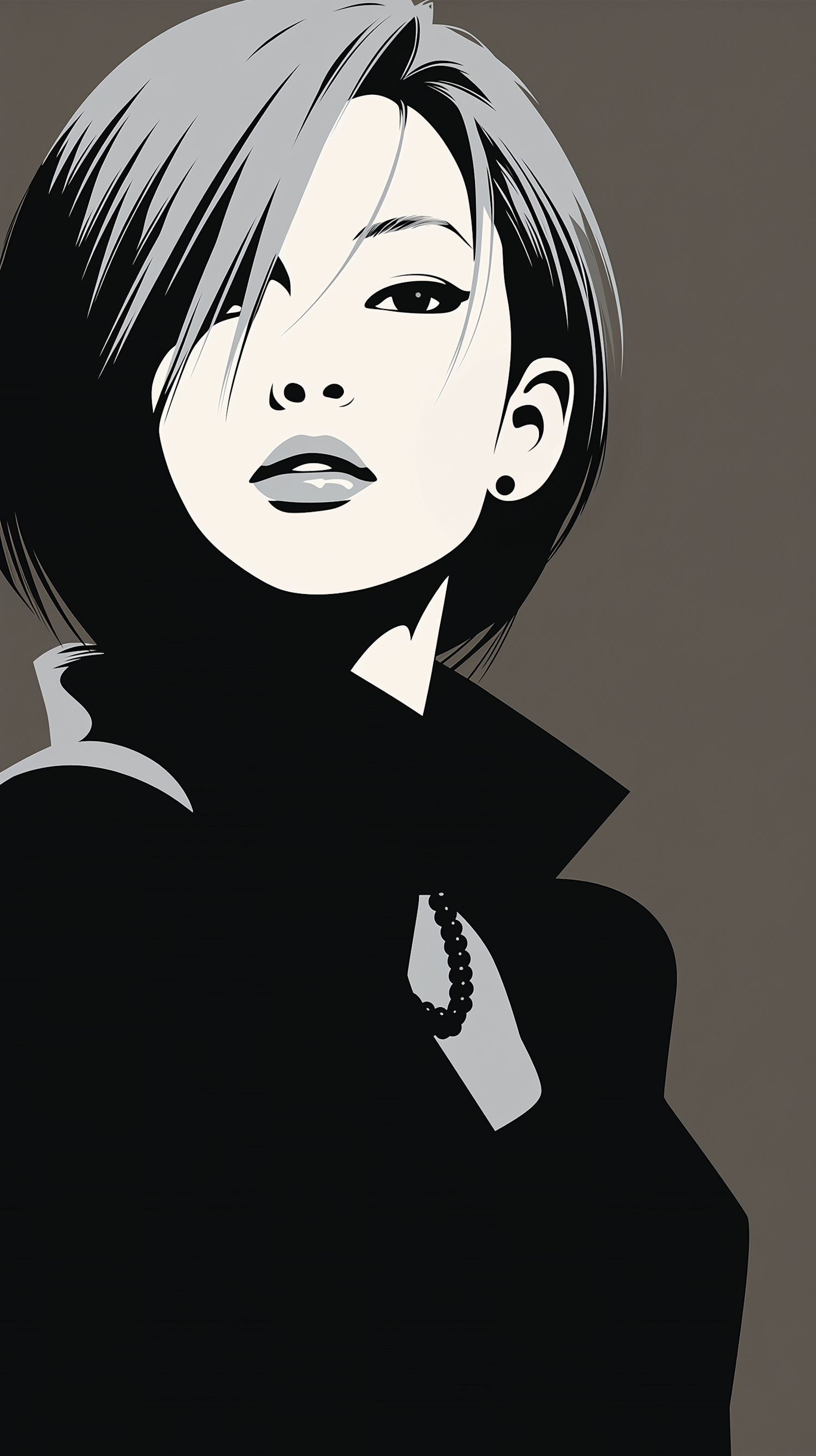 Stylized grayscale illustration of a woman with sleek hair and a high-collared outfit, exuding a modern and bold aesthetic.