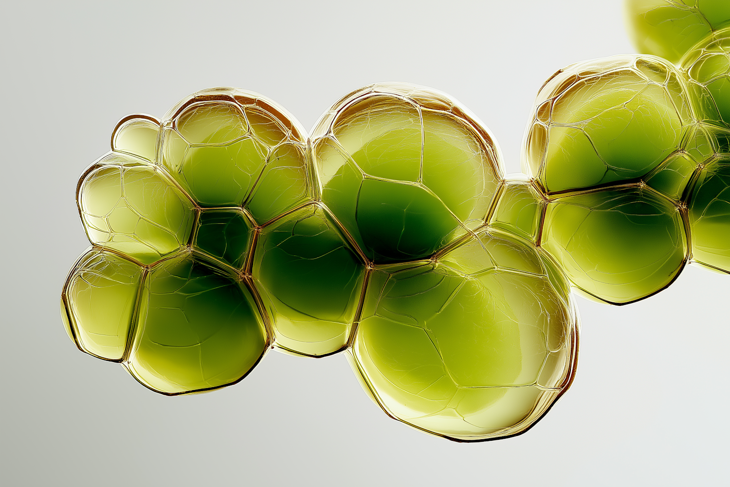 Abstract green bubble-like structures with a glossy texture and intricate web patterns, resembling cells or futuristic designs.