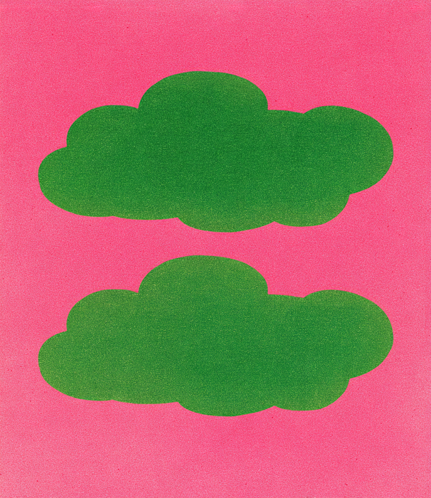A vibrant artwork with two green cloud shapes on a bright pink background, showcasing bold colors and a minimalist design.