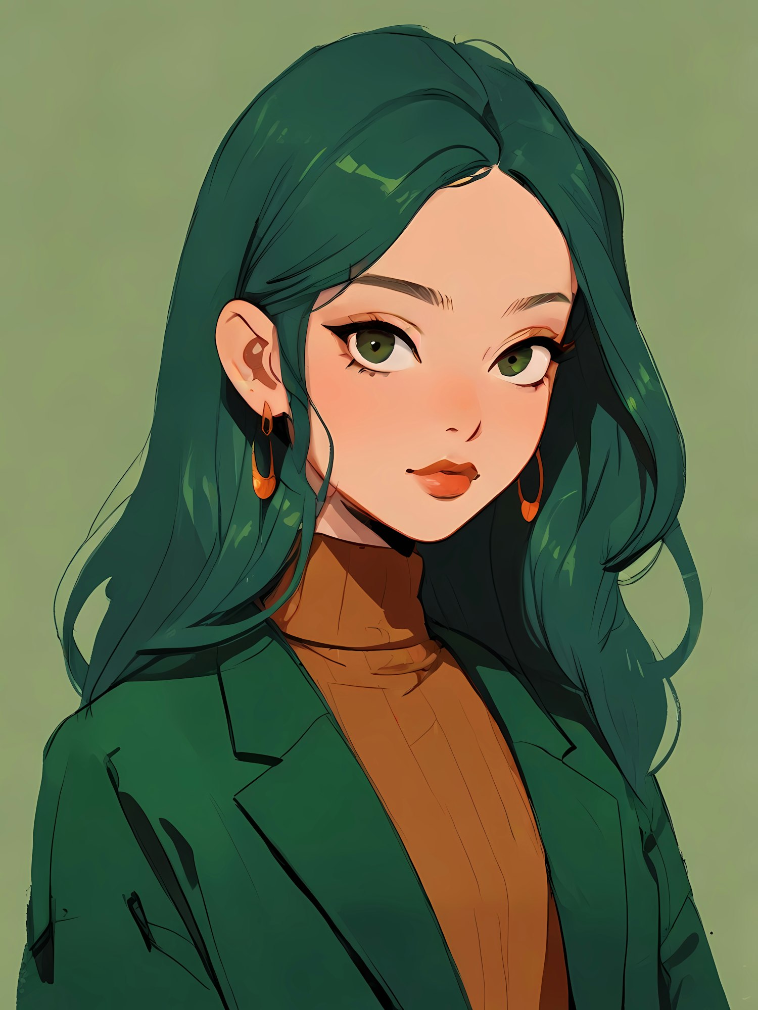 Stylish illustration of a woman with green hair, green eyes, and a chic outfit in earthy tones, set against a muted green background.