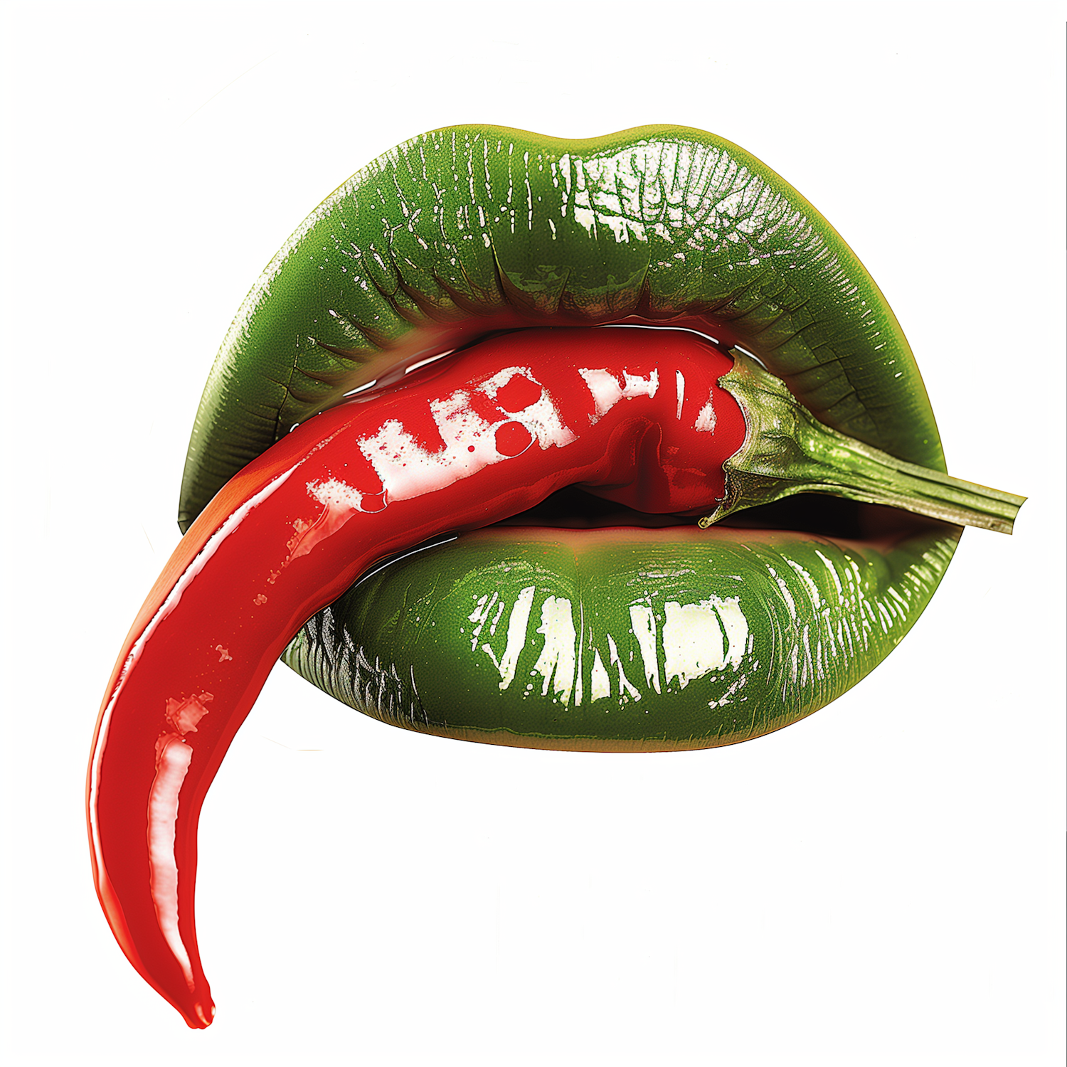 Glossy green lips holding a bright red chili pepper, creating a bold and vibrant contrast against a plain white background.