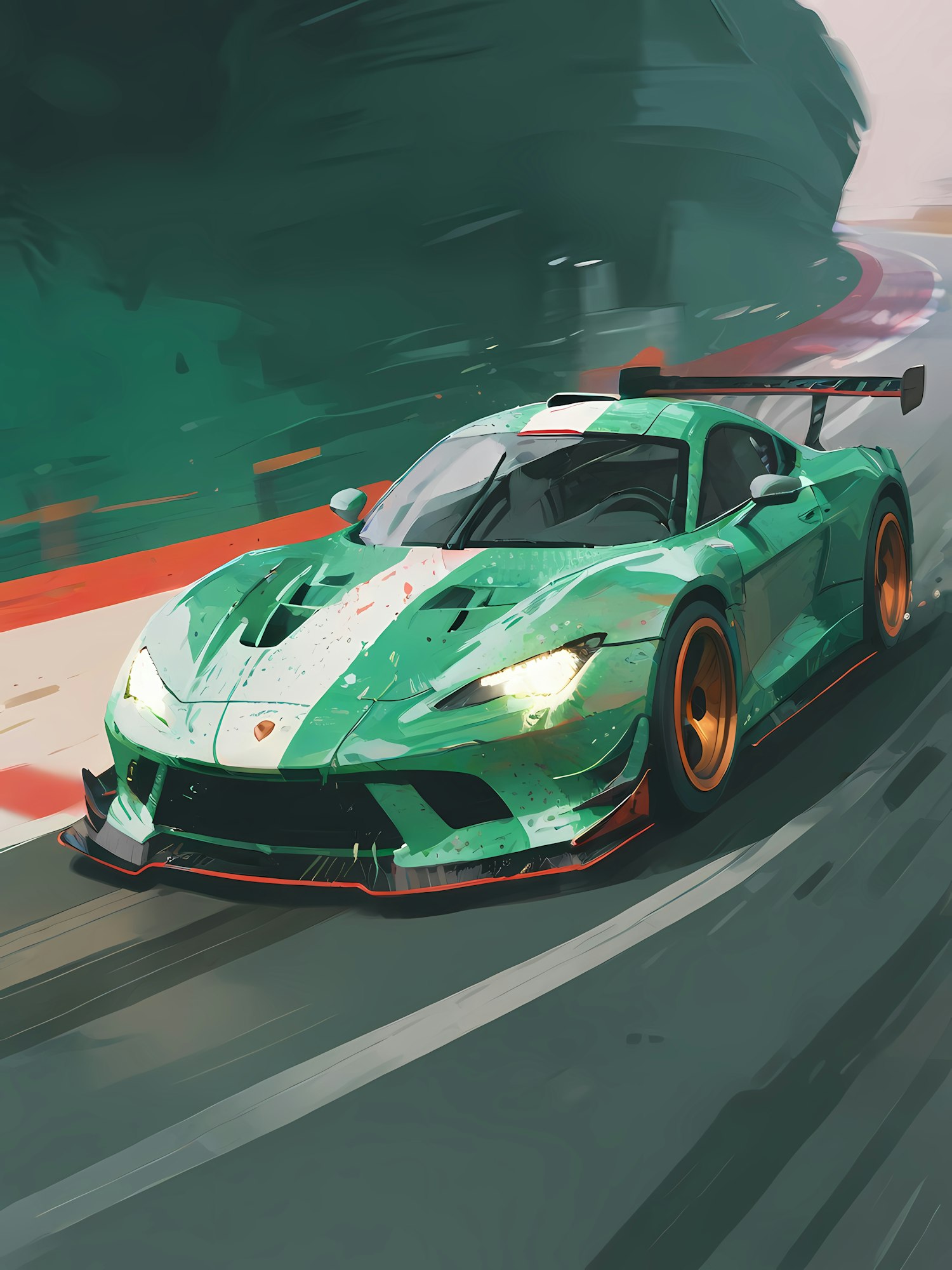 Sleek green race car with golden rims speeding on a curving track, featuring bold aerodynamic design and vibrant accents.