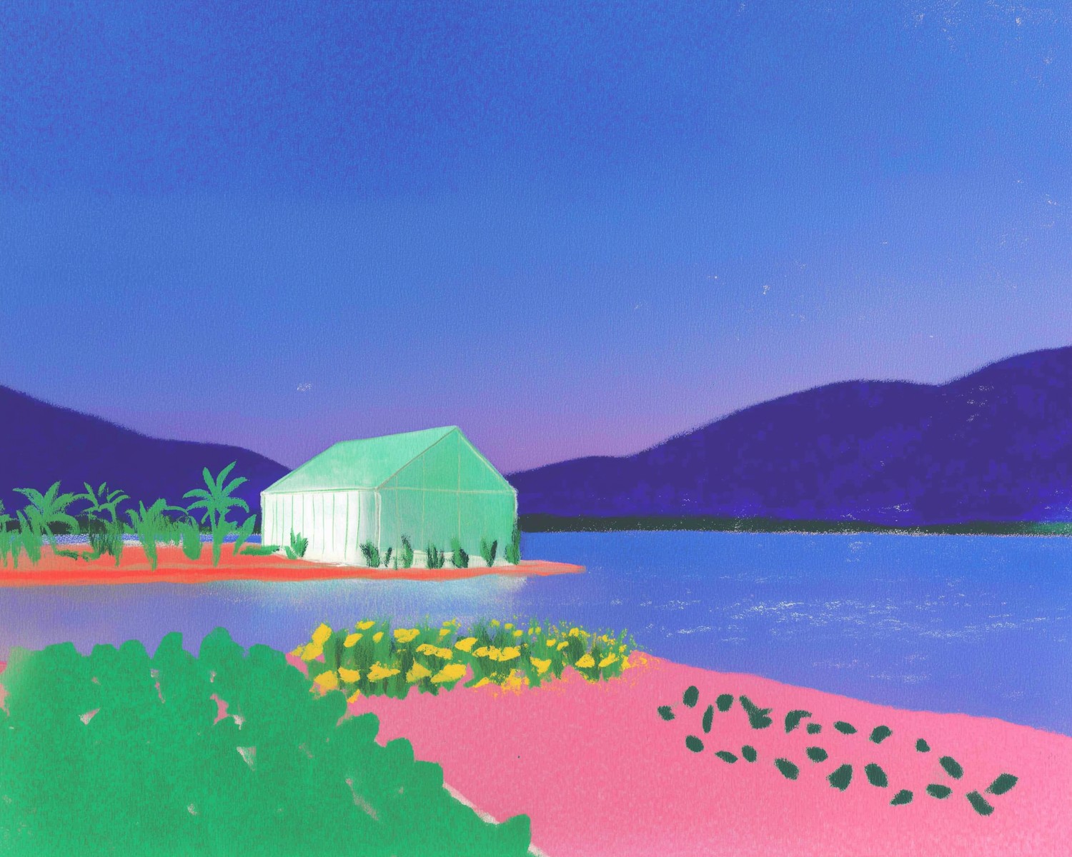 A vibrant illustration of a greenhouse by a lake, surrounded by lush greenery and colorful flowers under a serene sky.