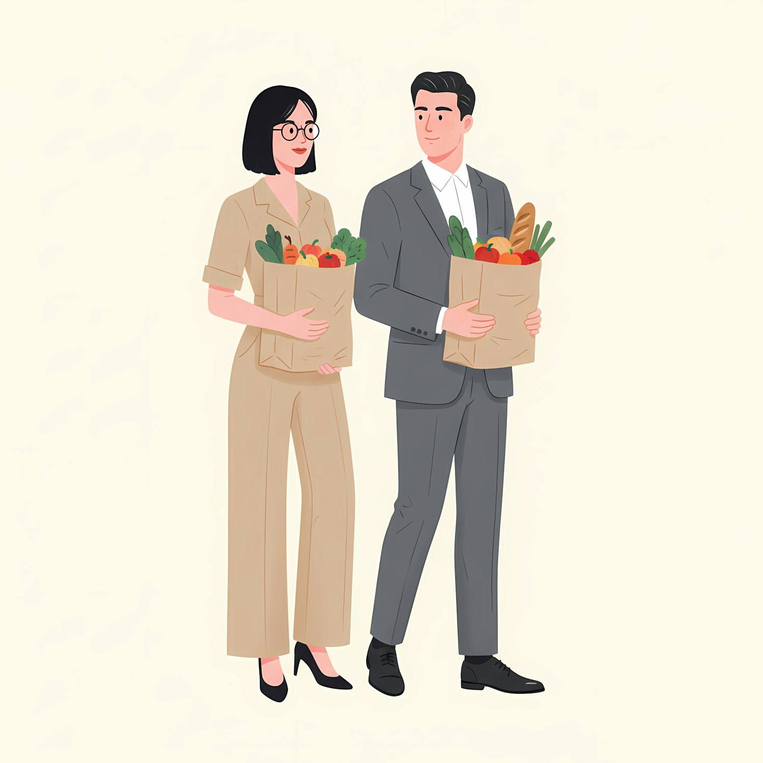 Illustration of a man and woman holding grocery bags filled with fresh produce, dressed in formal attire, against a light background.