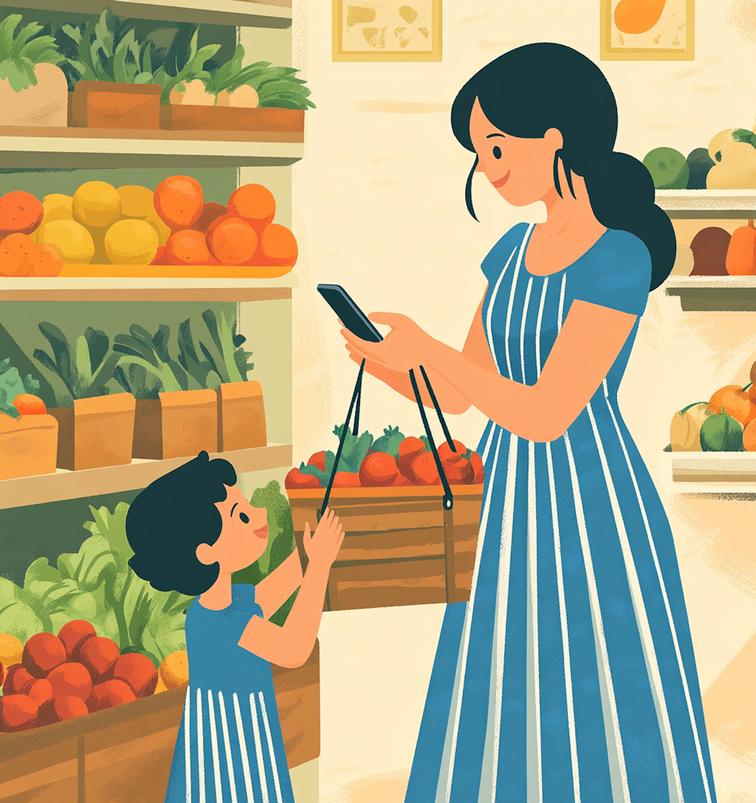 Illustration of a mother and daughter shopping for fresh produce, surrounded by colorful fruits and vegetables in a grocery store.