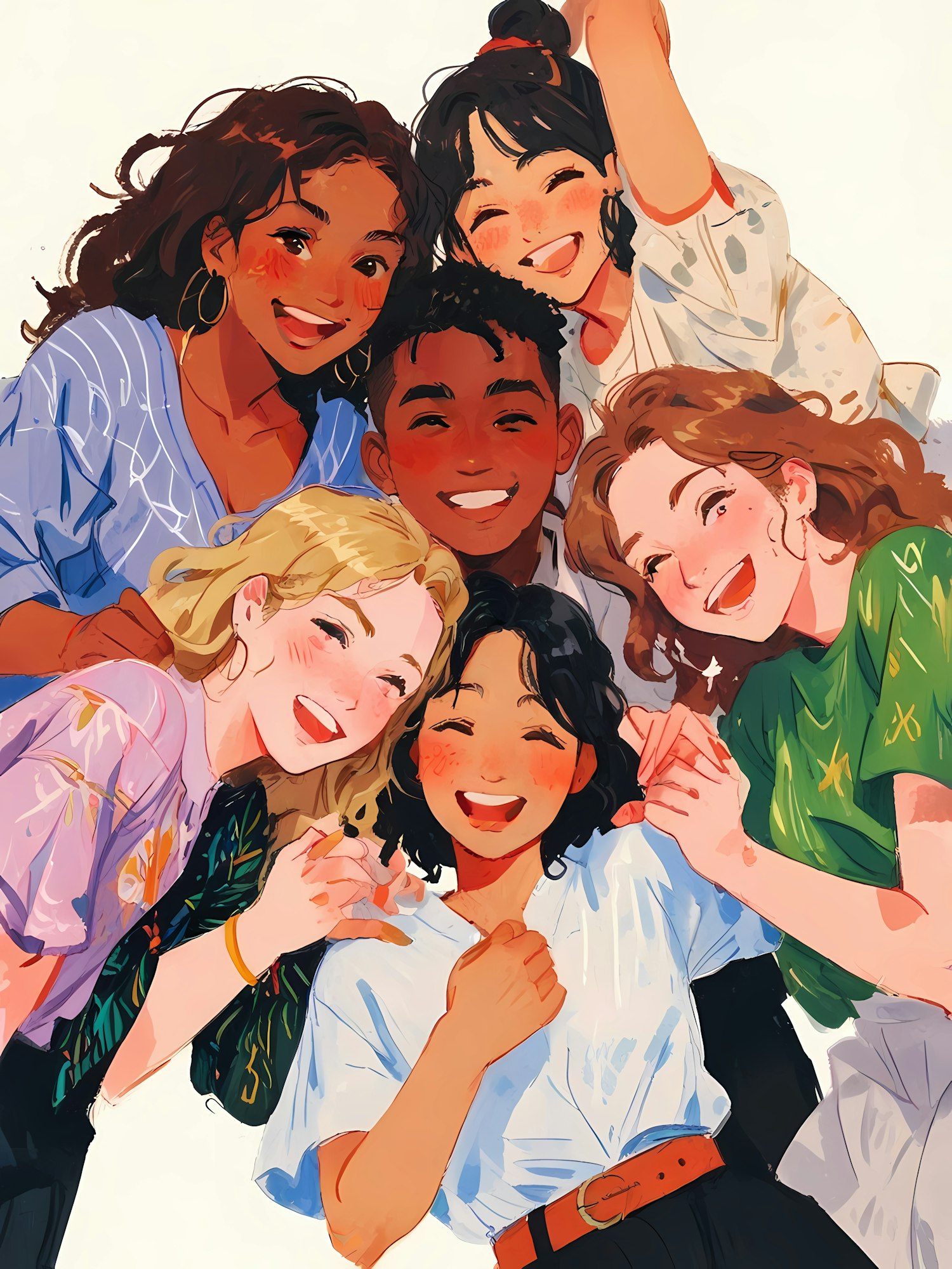 A cheerful group of friends sharing smiles, showcasing colorful clothing and diverse appearances, captured in a lively illustration.