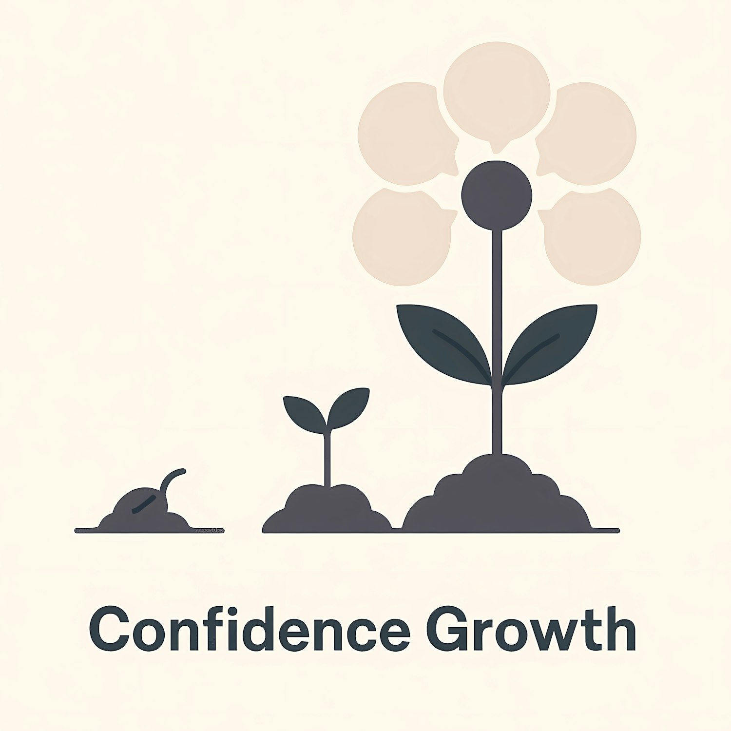 Minimalist illustration of a plant's growth stages symbolizing confidence development, with speech bubble petals and "Confidence Growth" text.