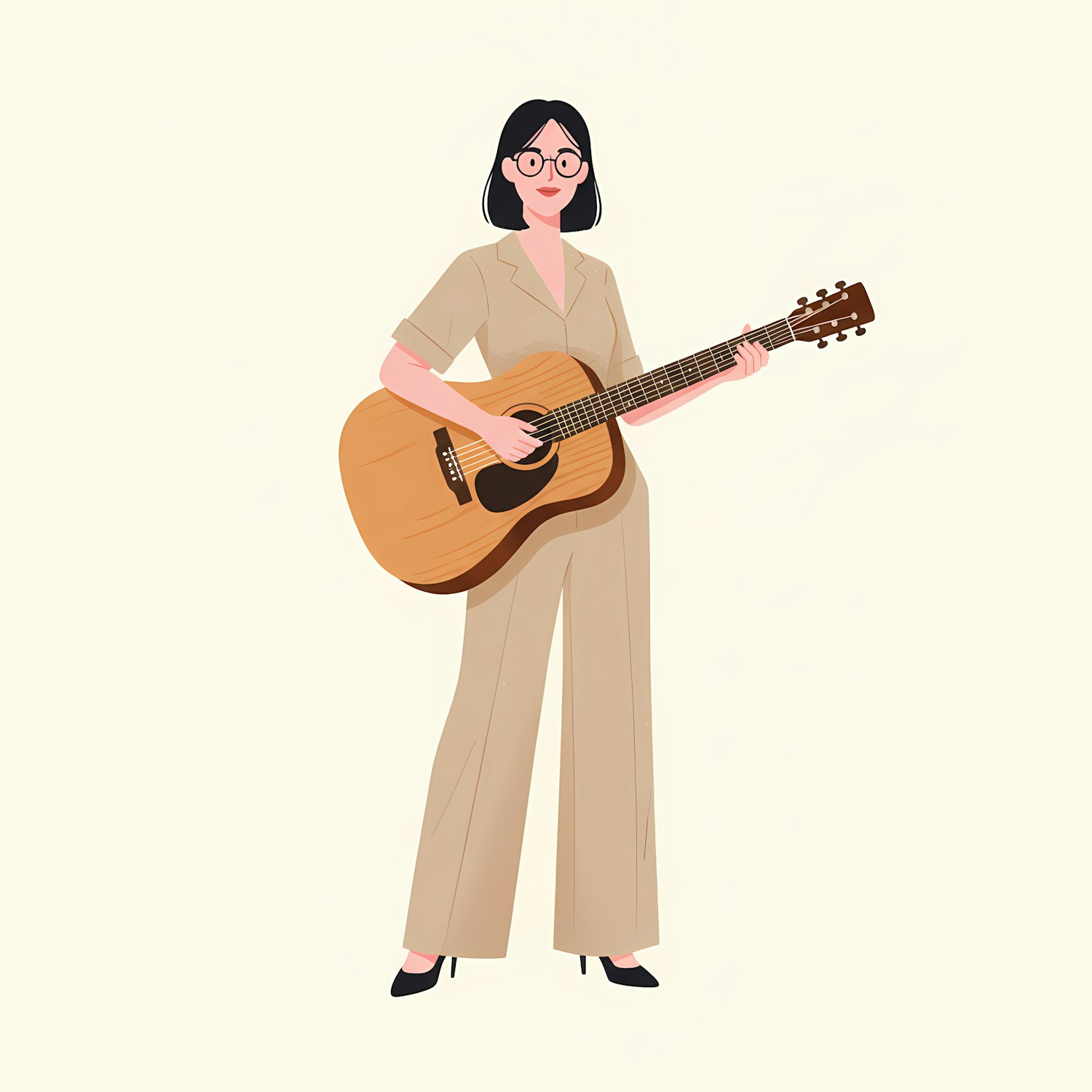 Illustration of a woman with glasses playing an acoustic guitar, wearing a beige jumpsuit and black heels, on a light background.