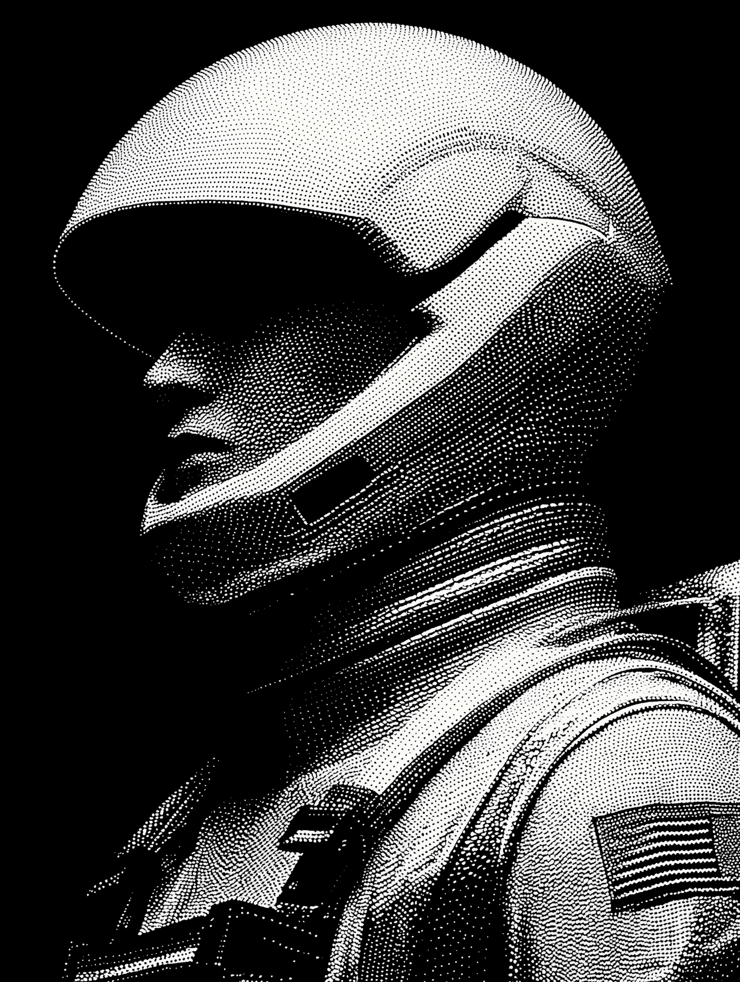Stylized halftone illustration of an astronaut in a helmet and suit with an American flag patch, set against a black background.