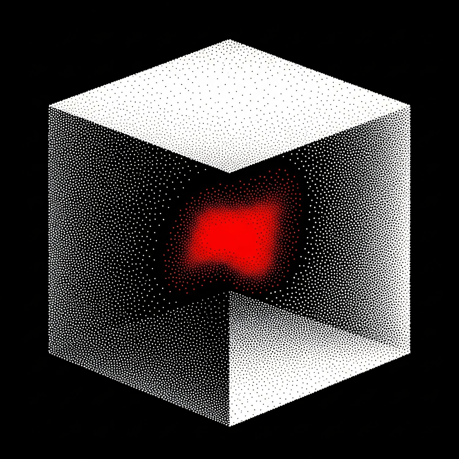 A halftone-style cube with a glowing red core, creating a striking contrast against the black background.