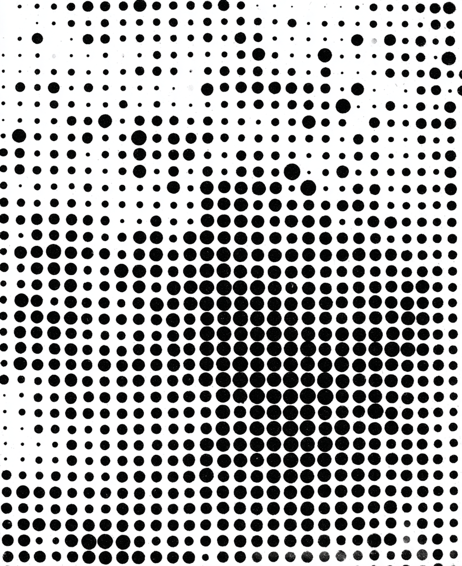 Halftone pattern with black dots on white, forming a gradient effect. The dots create a subtle image, blending art and design.