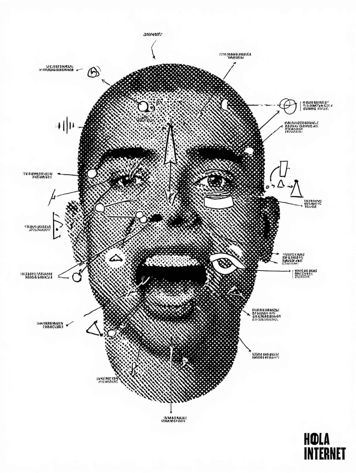 Halftone-style illustration of a face with annotations and symbols, blending art and science. Features "HOLA INTERNET" text in the corner.