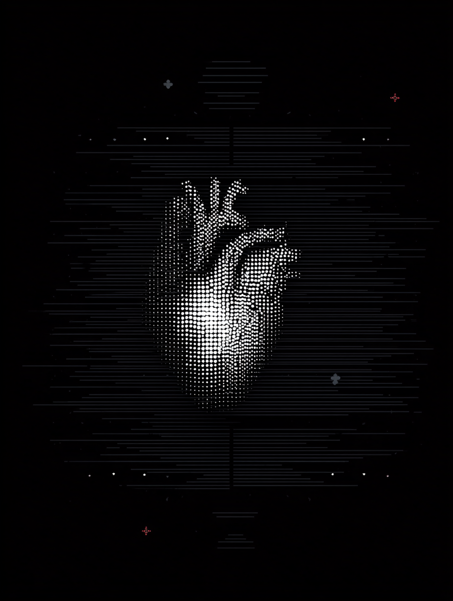 A digital halftone-style artwork of a human heart, set against a black background with abstract lines and shapes for a modern aesthetic.