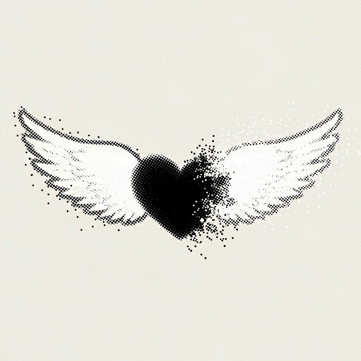 A halftone-style black heart with white wings on a beige background, blending modern minimalism with artistic abstraction.