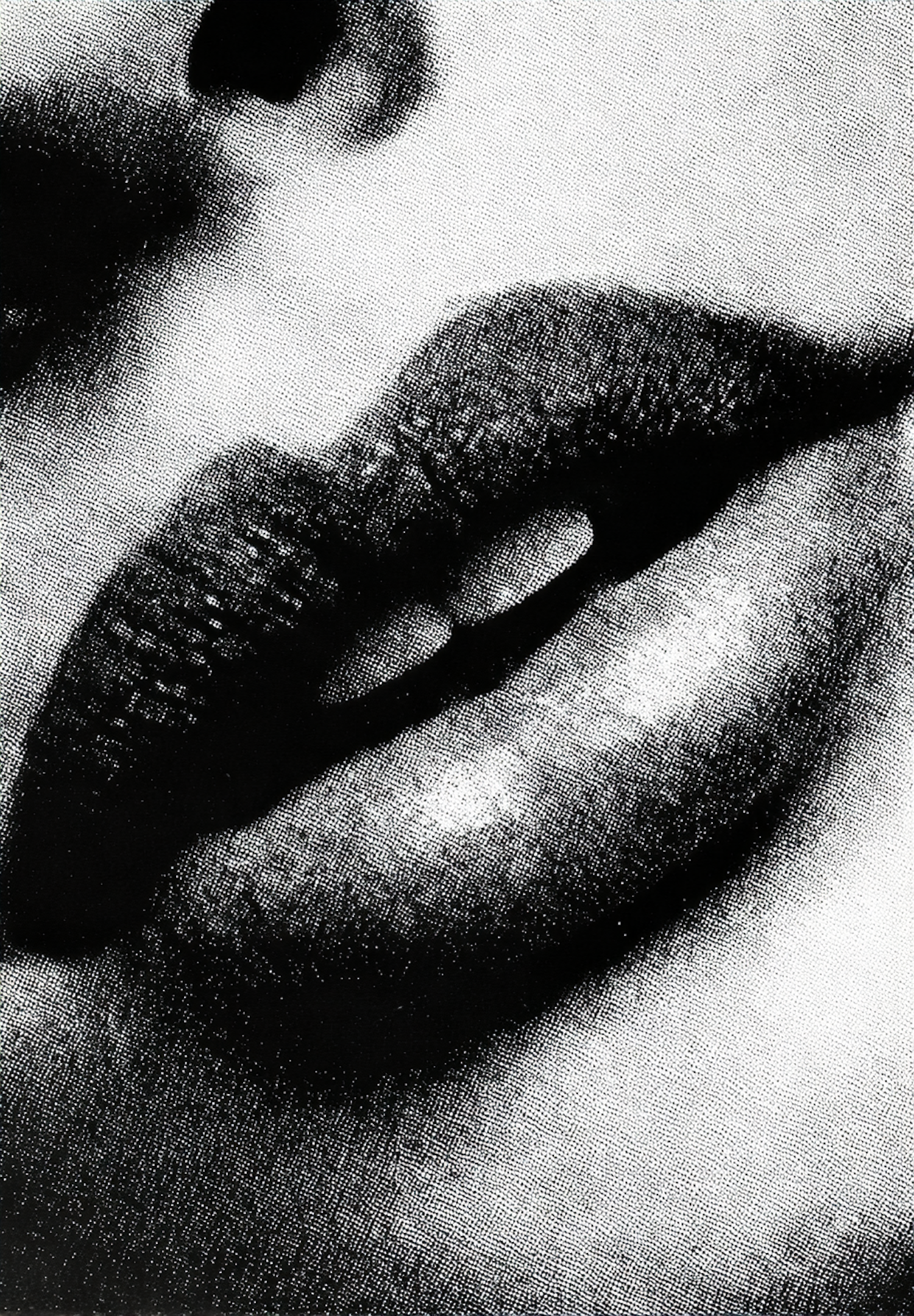 High-contrast halftone close-up of lips, emphasizing texture and form in a dramatic black-and-white composition.