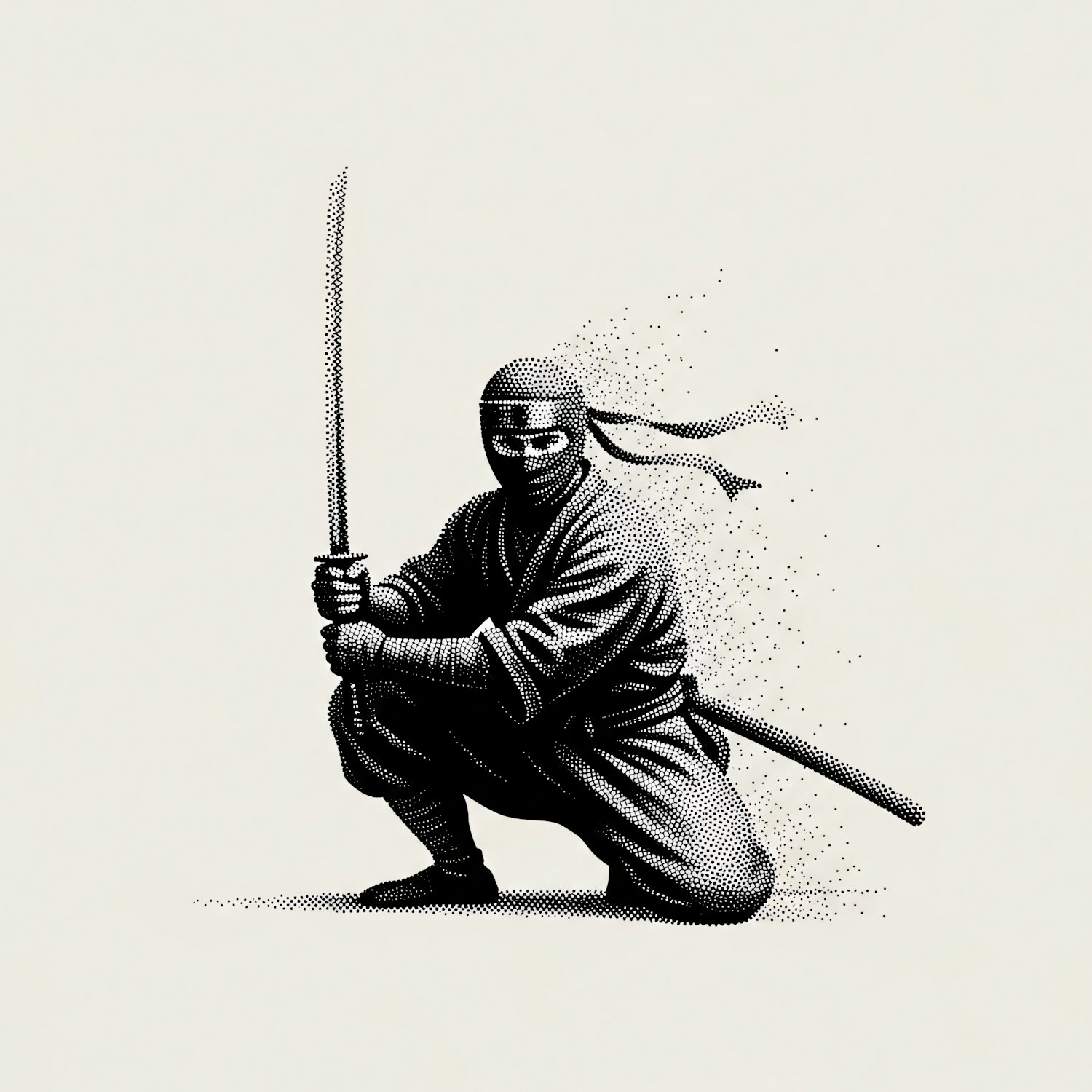 Stylized halftone illustration of a ninja crouching with a katana, showcasing dynamic pose and traditional attire in black and white.