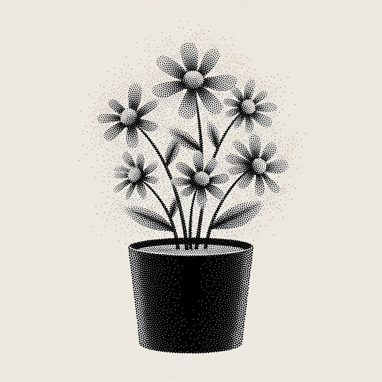 A halftone dot illustration of a potted plant with blooming flowers, showcasing a vintage and textured black-and-white aesthetic.