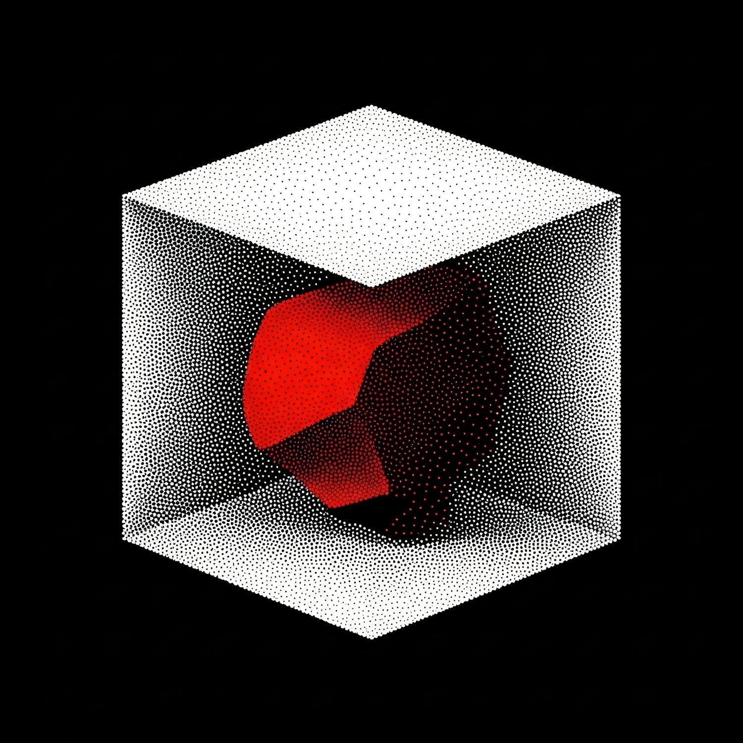 A red polyhedron inside a halftone cube on a black background, creating a striking geometric and textured visual effect.