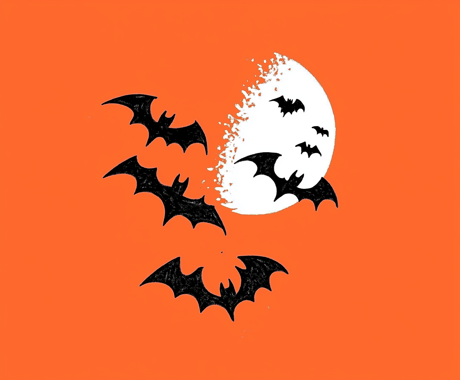 Halloween-themed illustration with black bats flying across a dissolving white moon on a bright orange background.